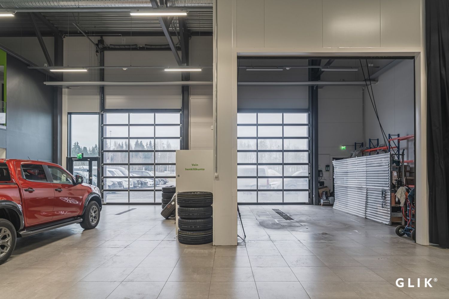 Liikehuoneistoon on kaksi suurta nosto-ovea ja käyntiovet. Nosto-ovien luona on lattiakaivot.