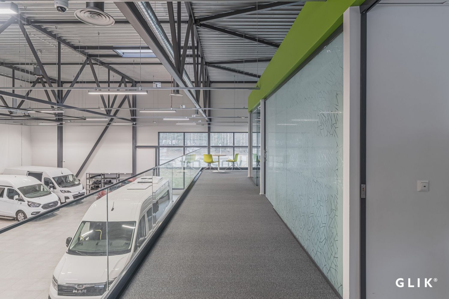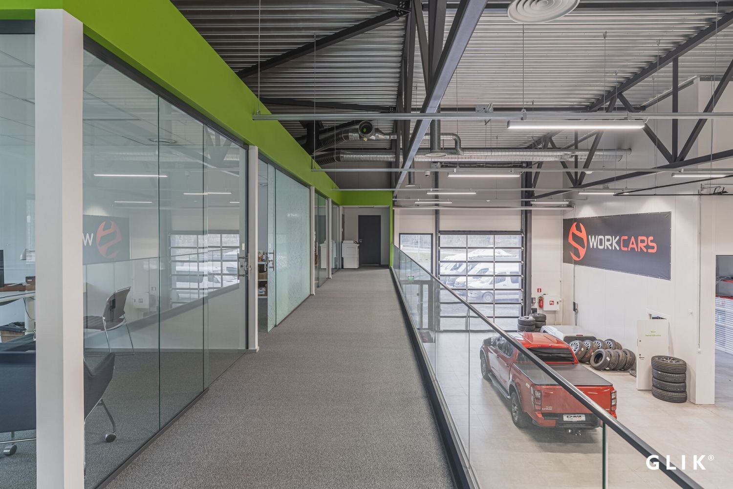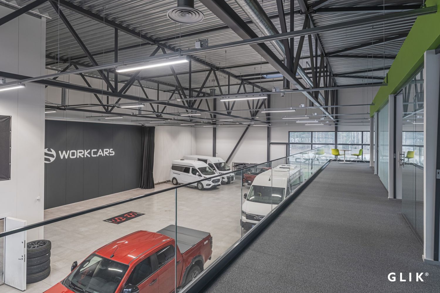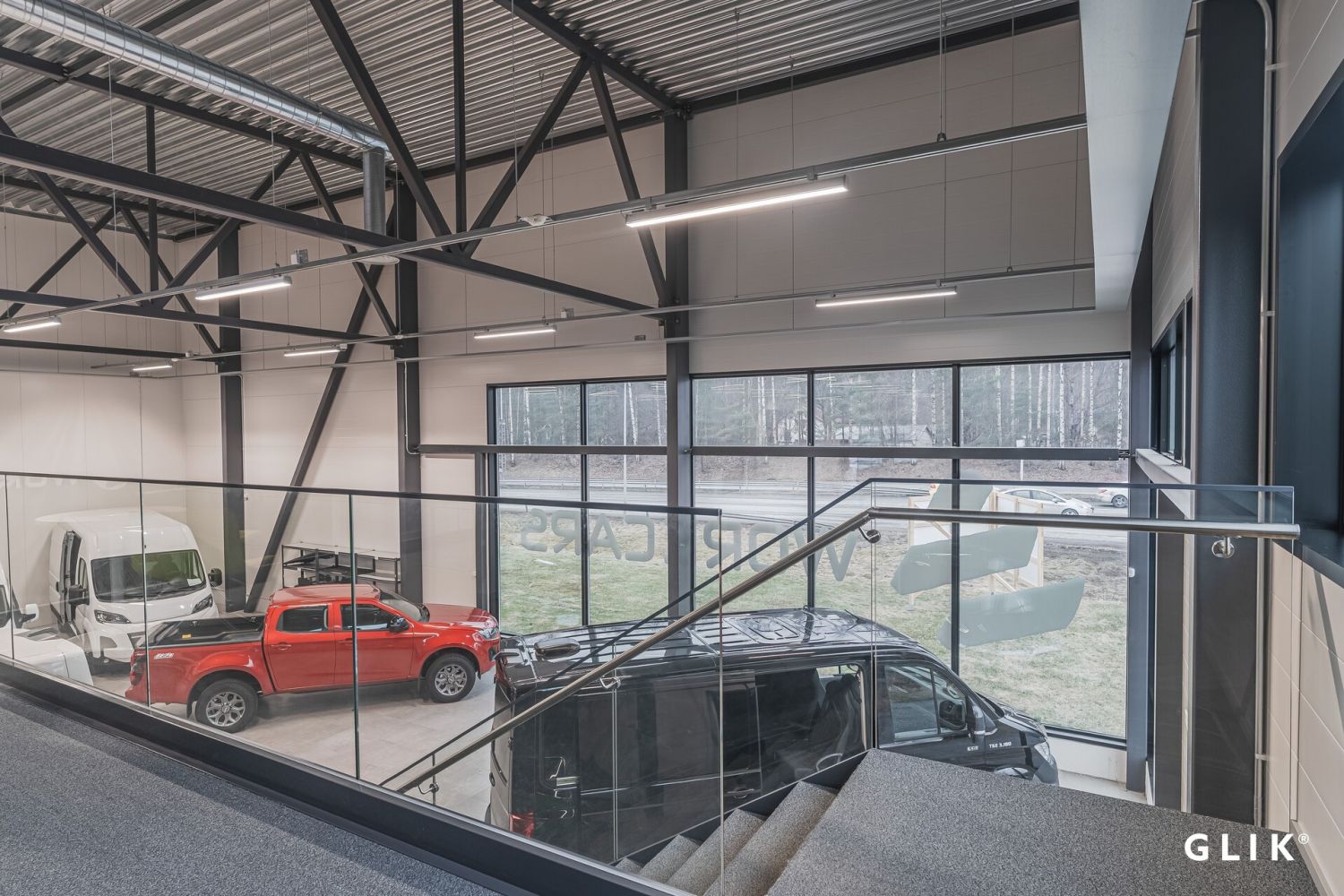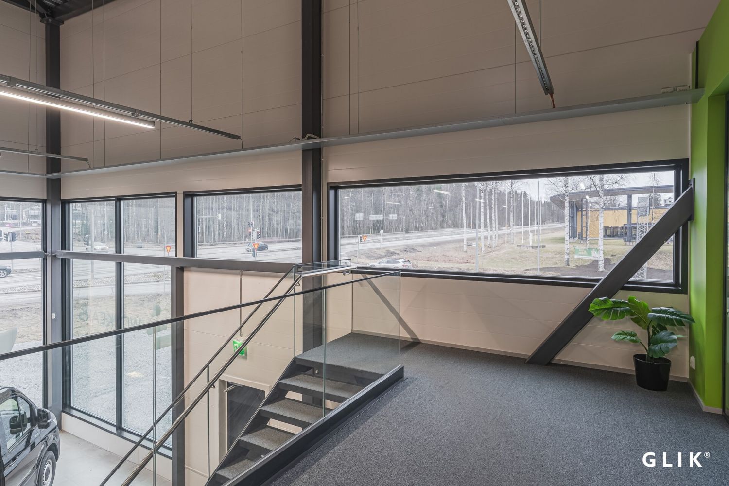 Korkea ja avara hallitila, jossa suuret ikkunat kahdella seinällä Vaasantien risteysalueelle.