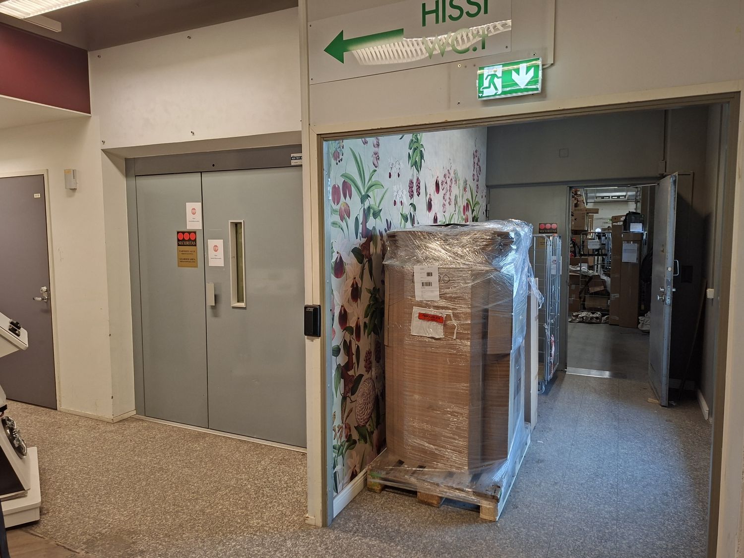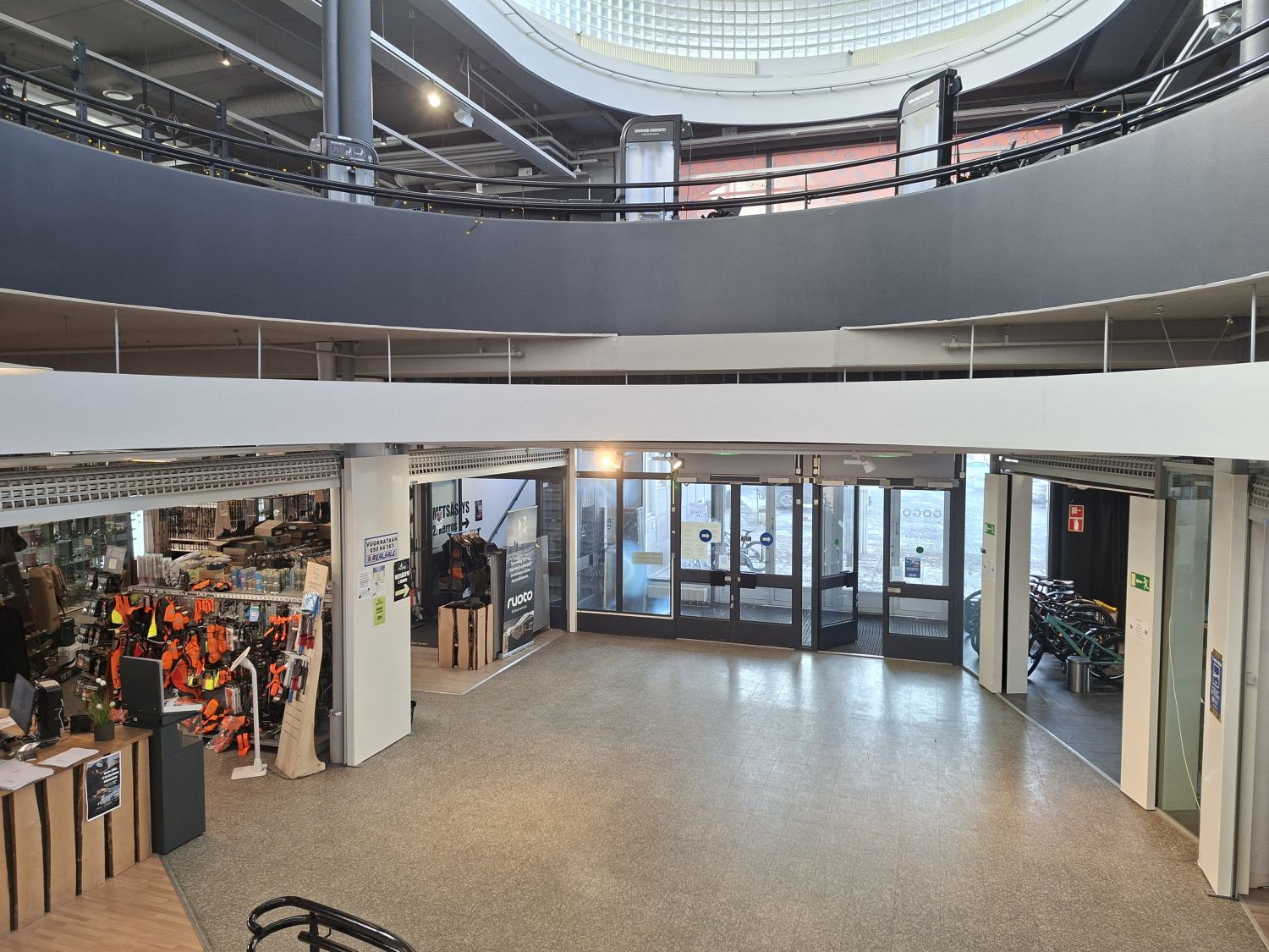 Liike-, näyttely- ja varastotilat.