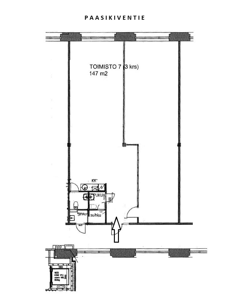 1.9. vapautumassa 3. kerroksessa toimistotila kooltaan 147 m2. Kulkuyhteys portaita tai hissiä käyttäen. Käytävällä myös reilun kokoinen tavarahissi, joten toimitilaan saa kuljetukset hyvin onnistumaan.
