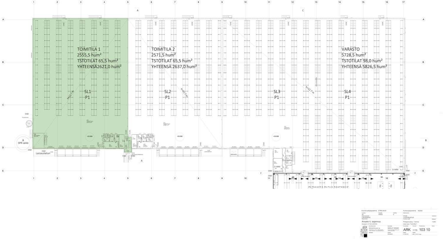 Vuokrataan loistavalta paikalta 11,7 metriä korkea varastotila 2555,5 m2, parvitoimisto 65,5 m2 ja 1. kerroksen sosiaali- ja taukotilat 65,5 m2. Varastoon on 5 lastaustaskua, lisäksi avolaituri nosto-ovi, lattiakantavuus 5000 kg/m2. Tilassa ei hyllyjä, hyllytettynä saa 5500 lavapaikkaa. Soita ja kysy lisää.