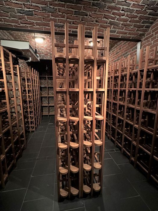 Tunnelmallinen viinikellari massiivisilla tiiliseinillä, holvikaarilla ja kauniilla puukalustuksilla ovat katseen vangitsijoita.
