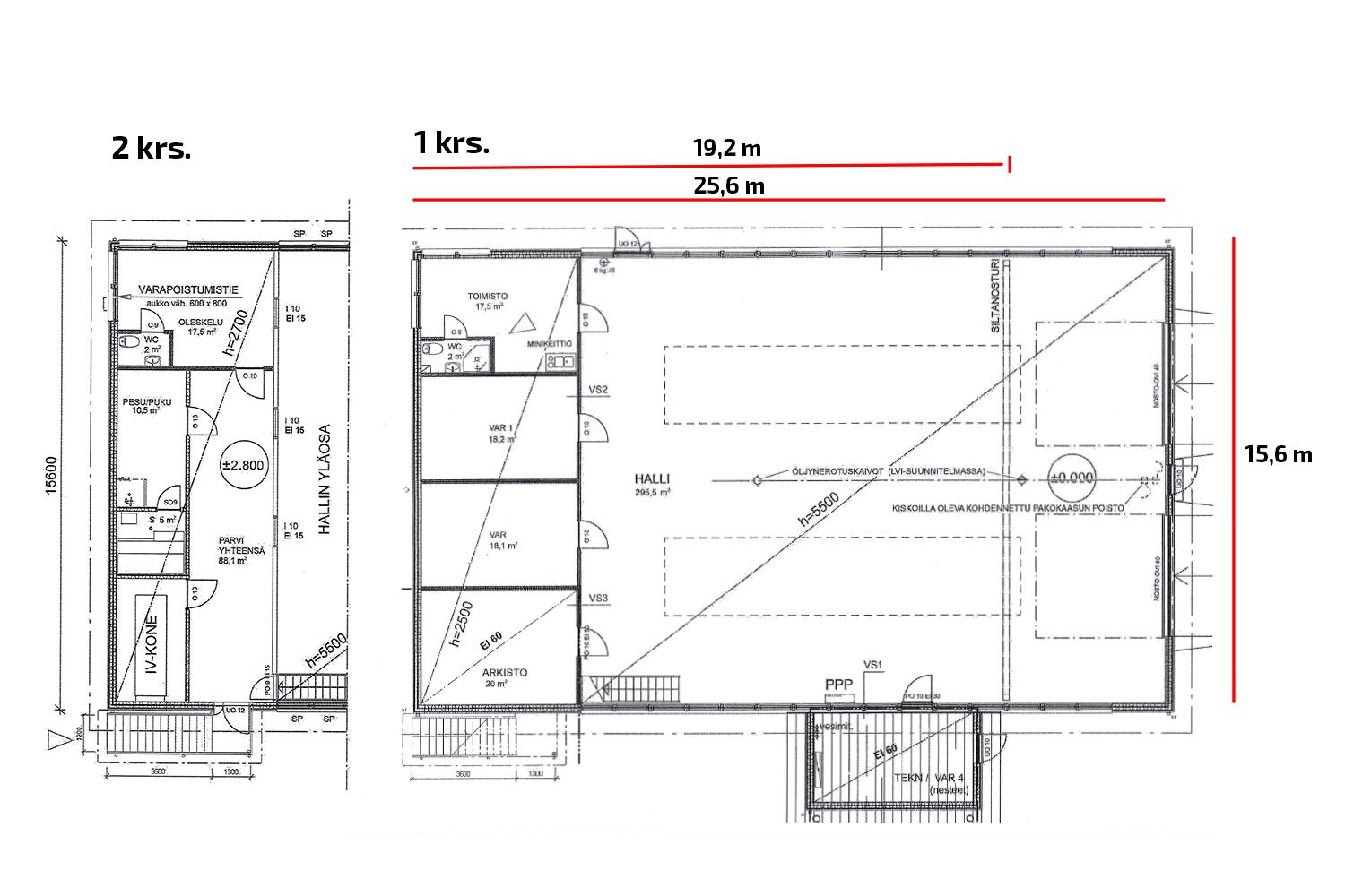 Hallirakennuksen pinta-ala on yhteensä noin 507 m² (bruttoala) ja sen toisessa päädyssä on kahdessa kerroksessa sekä varastotilaa että sosiaali- toimistotilaa. Hallitilan osuus pinta-alasta on 295,5 m² (katso sisämitat tarkemmin pohjakuvasta). Päädyn ensimmäisessä kerroksessa (75 m²) on muutama matalampi varastotila ja toimisto sekä wc. Rakennuksen toisessa kerroksessa (87 m²) on toimistotilaa sekä suihku- että saunatilat. Toinen kerros on tällä hetkellä vuokrattu toistaiseksi voimassa olevalla sopimuksella. Rakennuksen läntisellä puolella (1 krs.) on lisäksi tekninen tila pinta-alaltaan 20 m².