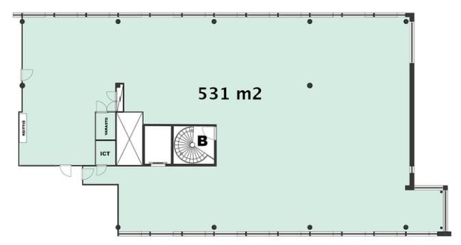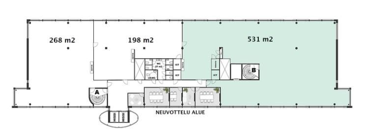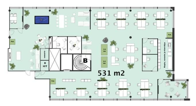 Tämä 531 m²:n puolikkaan toimistokerroksen tila tarjoaa tilat noin 38 työpisteelle. Tilankäyttöratkaisuihin ja materiaalivalintoihin voi vaikuttaa, joten voit luoda juuri sinun yrityksellesi sopivan työympäristön. Käytössäsi on myös vuokranantajan tarjoama sisustussuunnittelija, joka auttaa toteuttamaan visiosi. Ota yhteyttä, niin kerromme lisää!