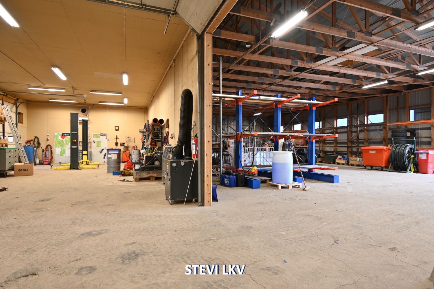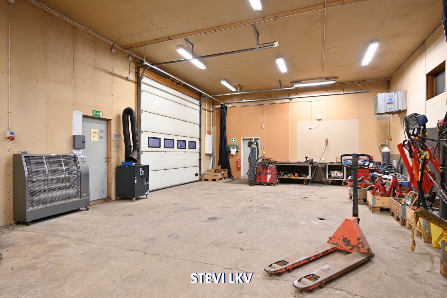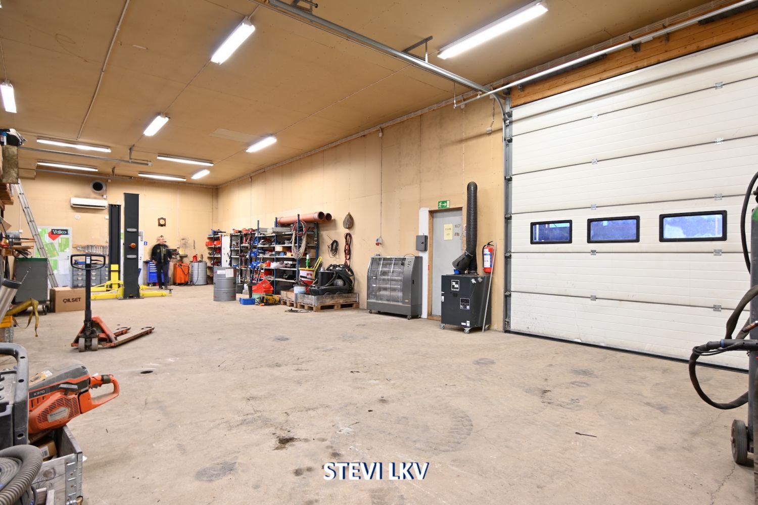 Lämpimään halliin on kaksi nosto-ovea.