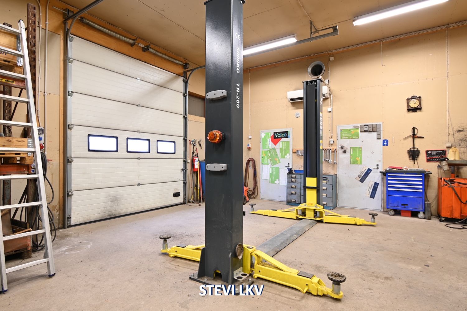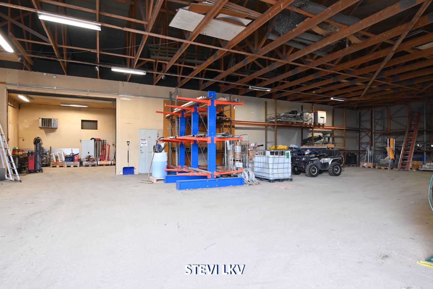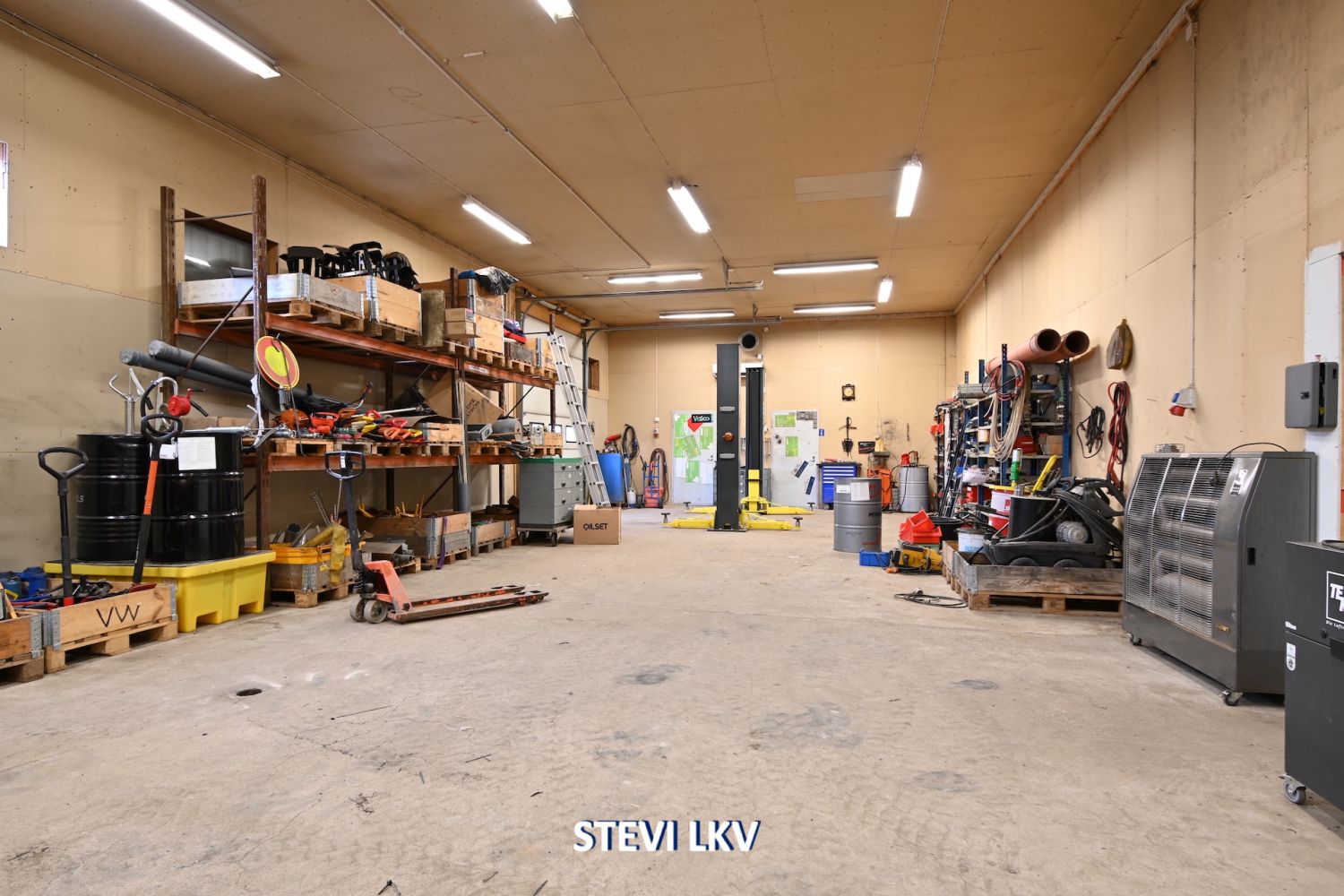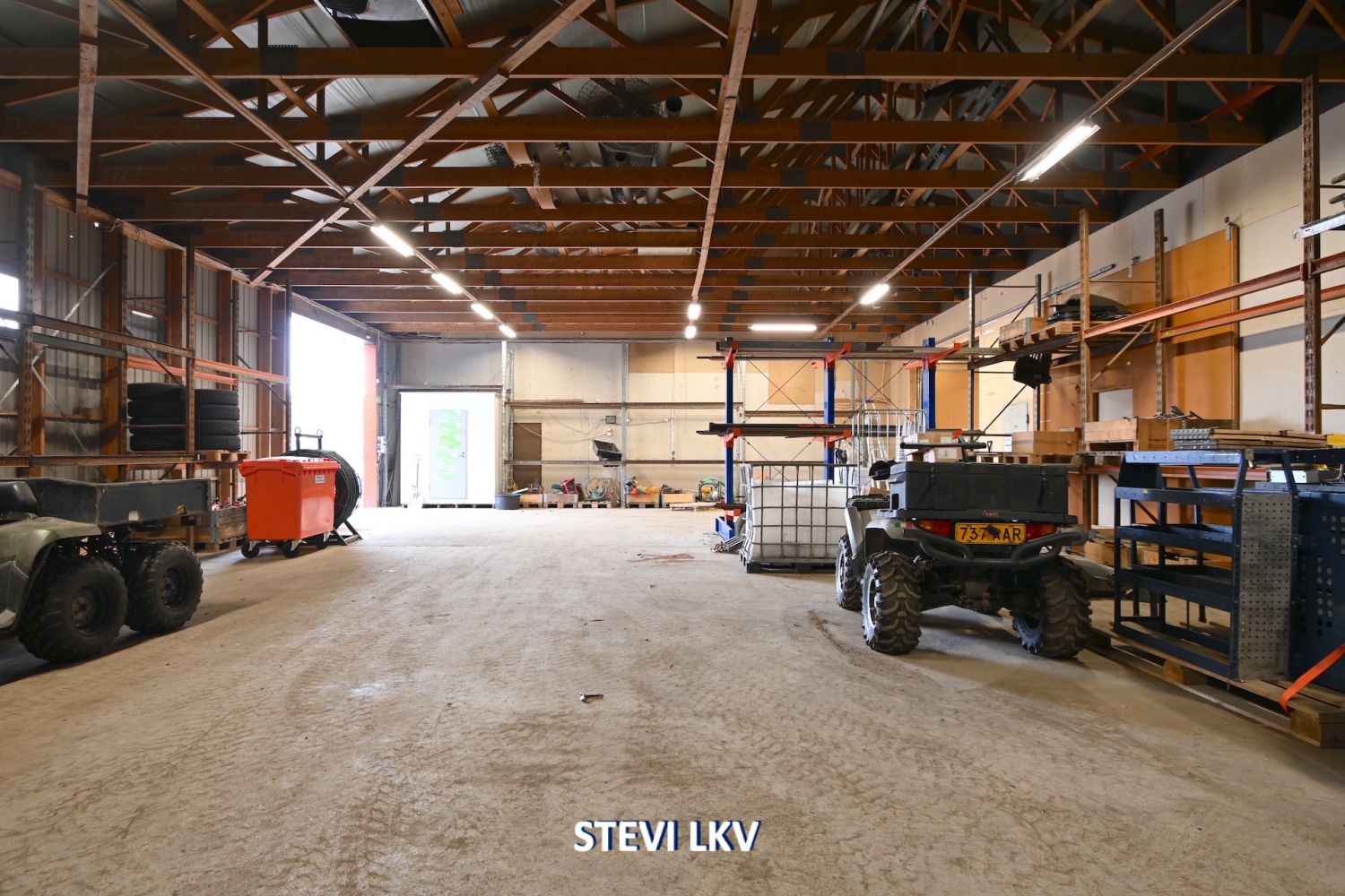 Lämpimään halliin on kaksi nosto-ovea.