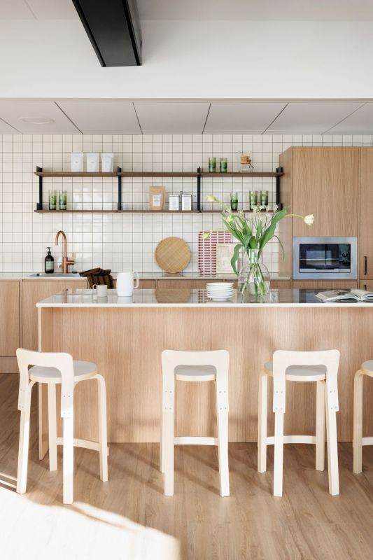 Pohjaratkaisu on selkeä ja käytännöllinen: työpisteet sijoittuvat ikkunalinjojen varrelle, mikä tuo runsaasti luonnonvaloa koko tilaan. Tukitilat, kuten keittiö ja wc-tilat, on sijoitettu keskitetysti, mikä tehostaa tilankäyttöä ja arjen sujuvuutta.