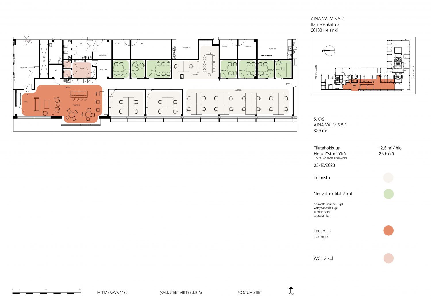 Upea Aina Valmis -konseptin mukainen 329 m² toimisto 5. kerroksessa.