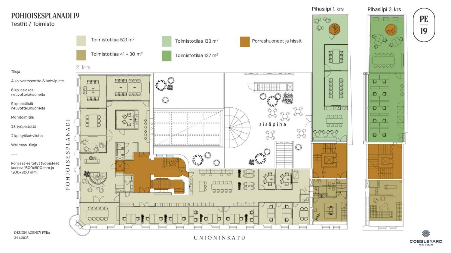 Kolmessa kerroksessa sijaitseva, monikäyttöinen tila tarjoaa inspiroivan ympäristön Pohjoisesplanadin sisäpihalla, Arno Ruusuvuoren suunnittelemassa arkkitehtonisesti merkittävässä rakennuksessa.