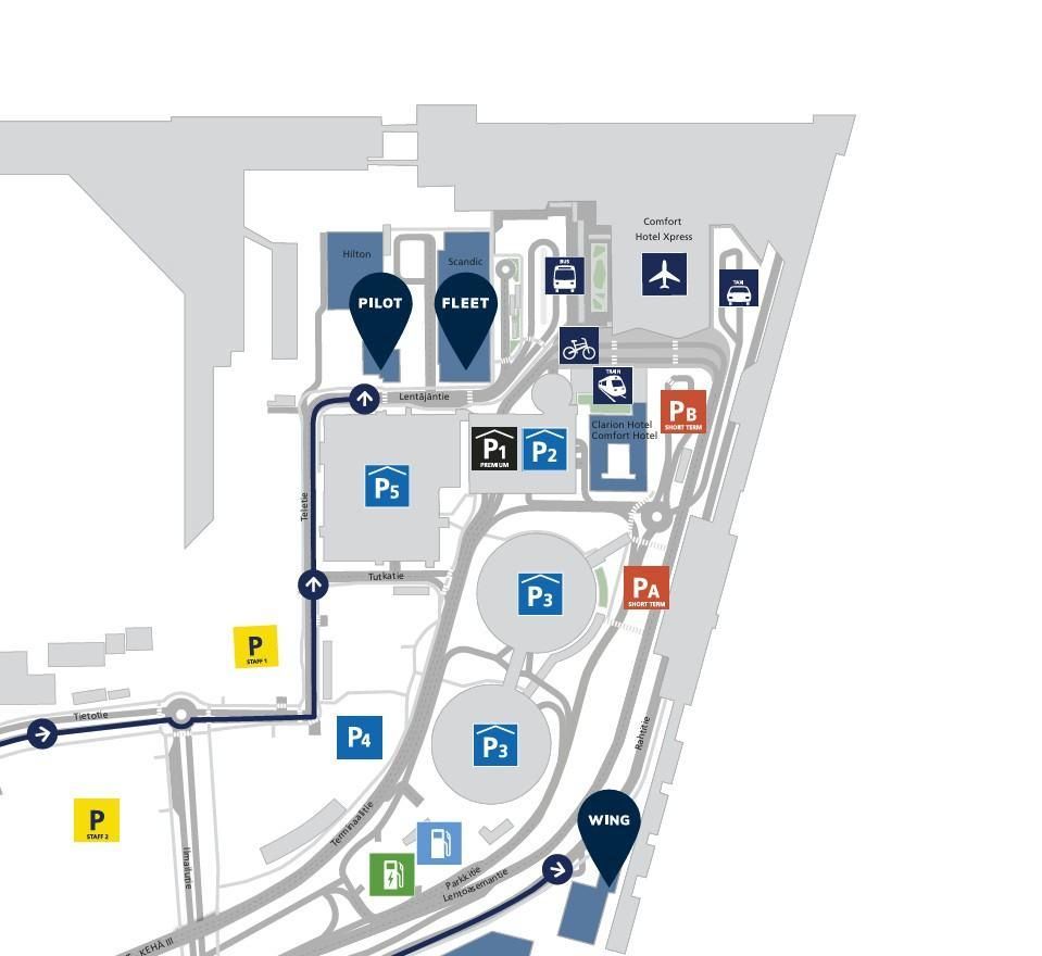 Saapuminen on sujuvaa sekä henkilöstölle että vieraille. Pihalla on vieraille maksuton kahden tunnin pysäköinti, ja viereisissä pysäköintihalleissa ja ulkokentillä on runsaasti mahdollisuuksia. Parkkipaikkoja alueella on yhteensä 15 000 (ks. pysäköintikartta kuvista). Lentokentän lähtöaulaan, Kehäradan juna-asemalle ja bussiterminaaliin kävelet vain muutamassa minuutissa!