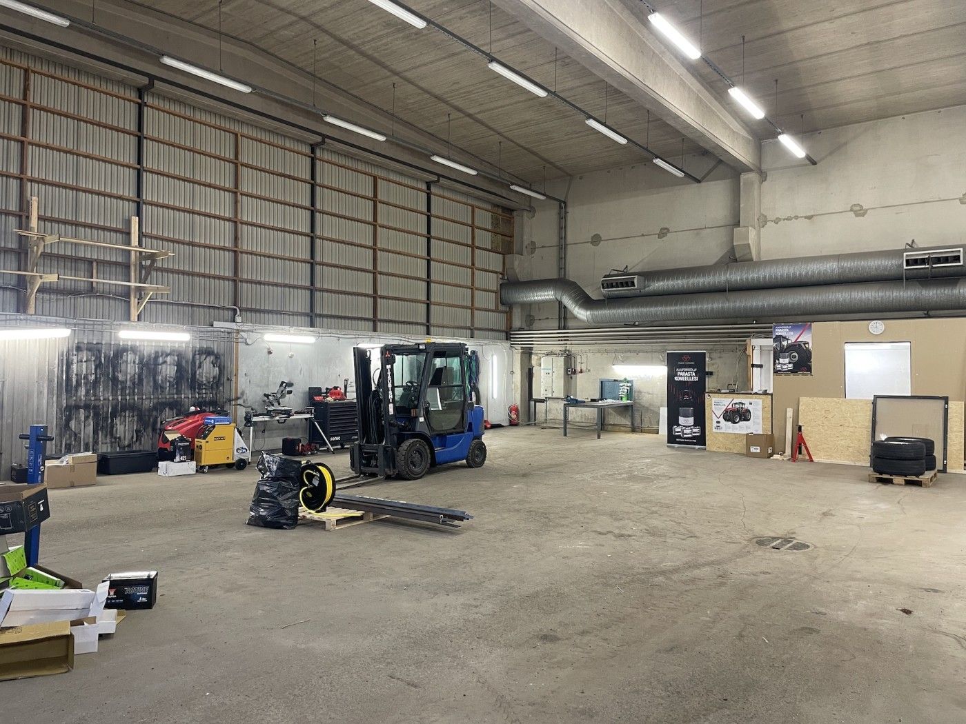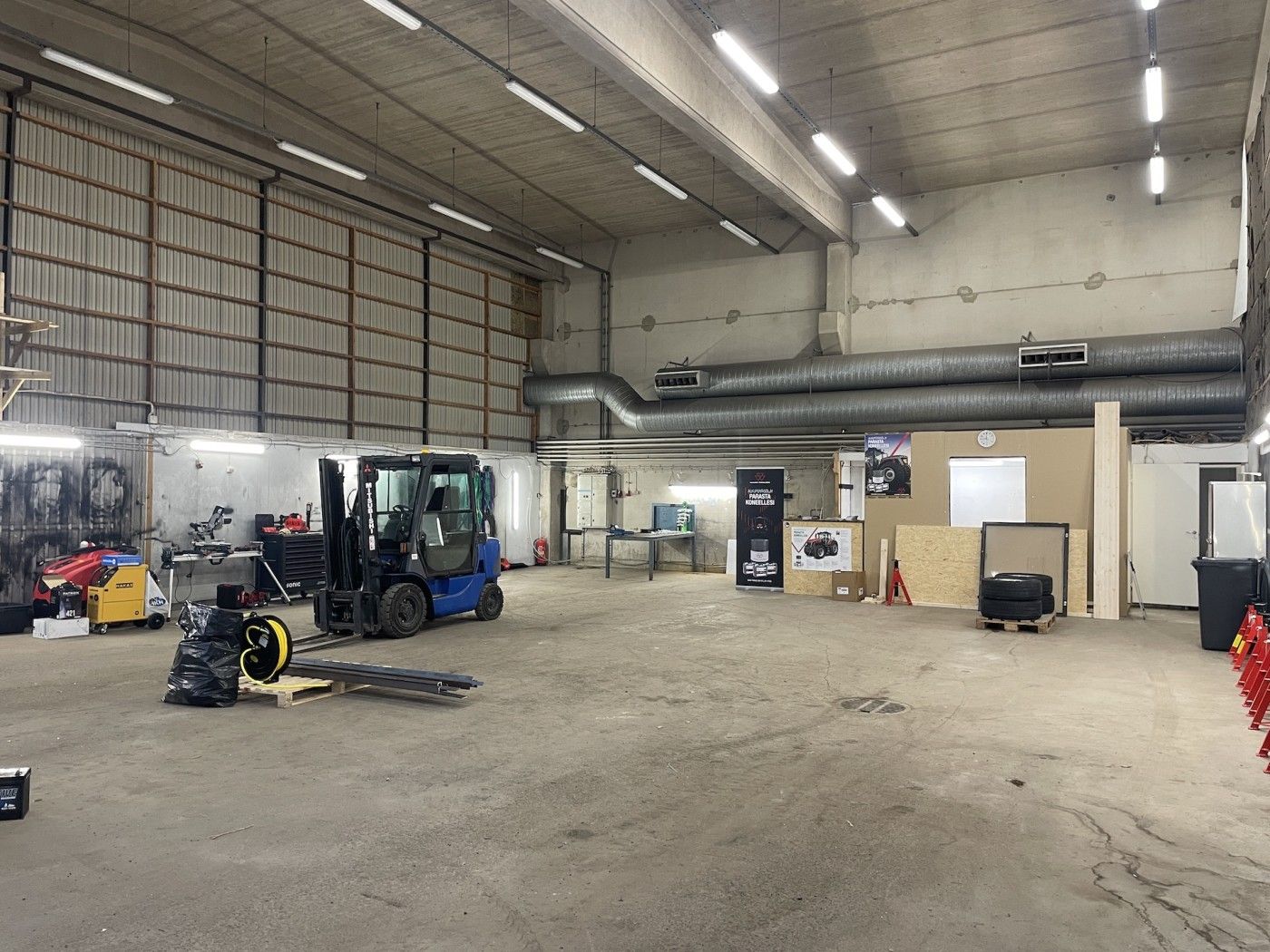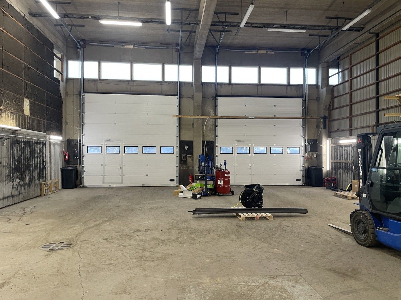 Hallin vapaa korkeus 6,3m, lattiakaivoja 2 kpl jossa hiekan-öljynerottimet.