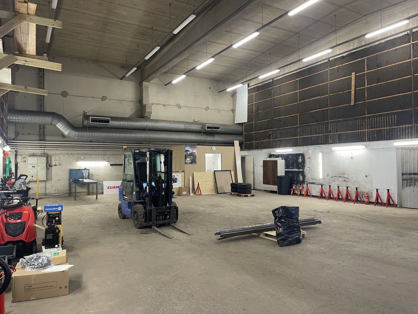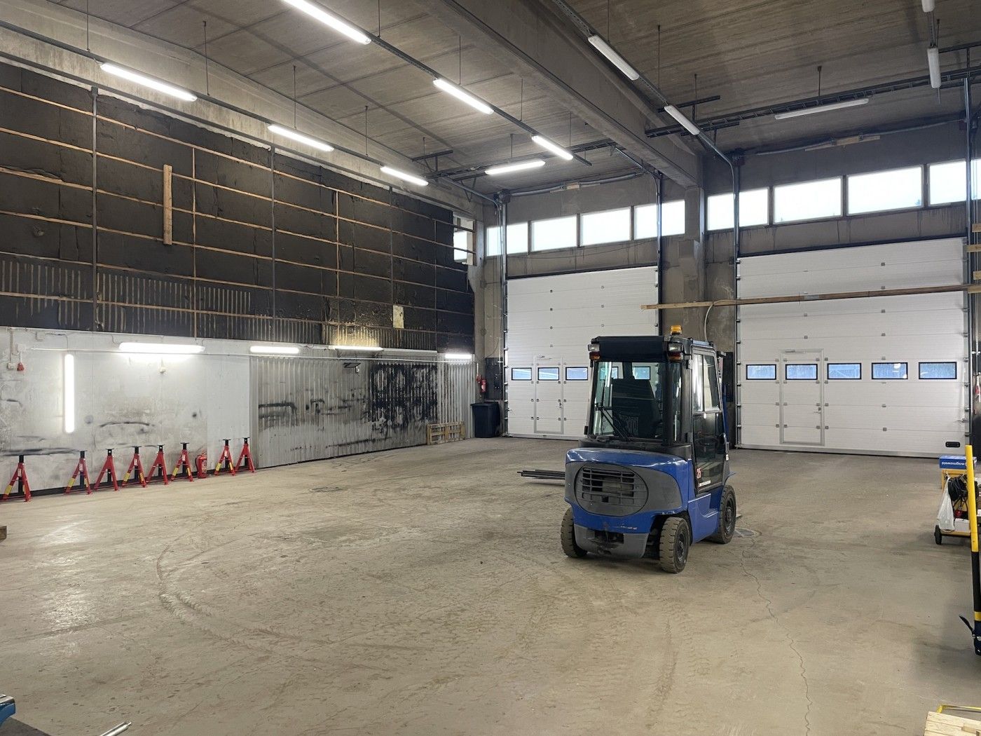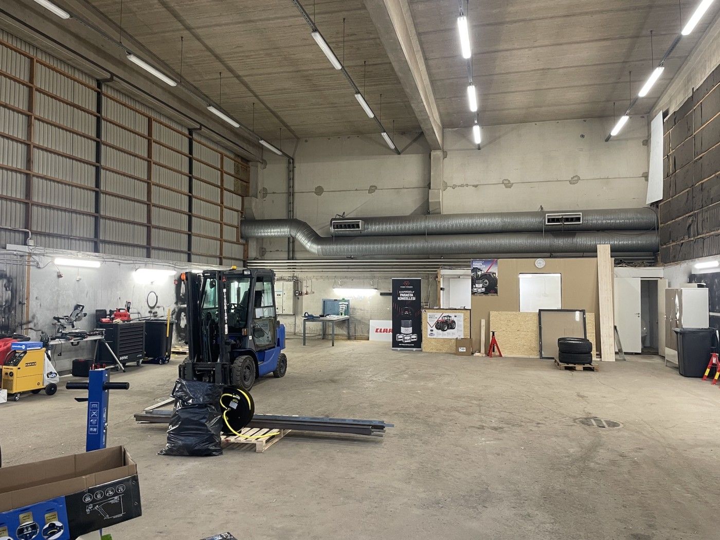 Hallin vapaa korkeus 6,3m, lattiakaivoja 2 kpl jossa hiekan-öljynerottimet.
