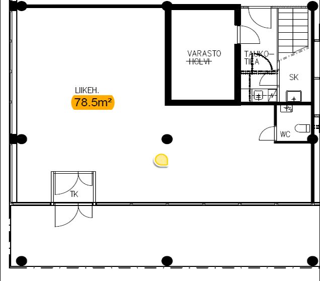 Tila on pohjaratkaisultaan selkeä ja avoin, mikä mahdollistaa joustavat sisustusratkaisut niin myymälä-, toimisto- kuin palvelukäyttöönkin. Suuret näyteikkunat tuovat tilaan runsaasti luonnonvaloa ja tarjoavat loistavan pinnan yrityksen markkinoinnille. Sisäänkäynti on vaivaton suoraan katutasosta, mikä palvelee erinomaisesti myös esteetöntä asiointia.