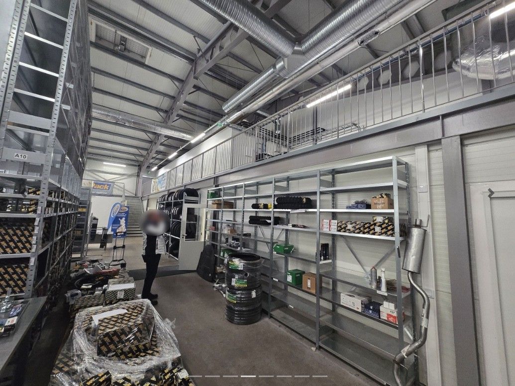 Samassa rakennuksessa toimii lounasravintola ja autohuolto. Hallin ympäri pääsee autolla.