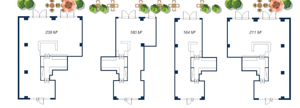 Katutason neljässä liiketilassa ravintolatoimintaan on valmistauduttu jo etukäteen. Jokaiseen tilaan kuuluu oma keittiö, varastotila ja osuus yhteisistä sosiaalitiloista. Keittiöt ovat lähestulkoon laitteita vaille valmiit ja niissä on rasvakaivo, kaksi huuvaa sekä asianmukainen lattiapinnoite. Tiloissa on valmiina ravintolatoiminnan vaatima ilmanvaihto, tasainen betonilattia ja katossa mustalla ylimaalattu täysin uusittu talotekniikka.