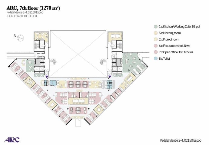 Keilaniemen ARC on uudistuva toimistokampus Espoon Keilaniemessä, meren rannalla. Entinen Nokia-talo kehittyy vaiheittain moderniksi työympäristöksi, jossa yhdistyvät toimivat tilaratkaisut, hyvät palvelut ja keskeinen sijainti. Tarjolla on valoisia ja muuntojoustavia toimitiloja eri kokoisille yrityksille. Tilat tukevat hybridityötä ja arjen sujuvuutta: avoimet työalueet, kokoustilat ja yhteiset lounge-tilat mahdollistavat sekä keskittymisen että yhteistyön. Kiinteistön vahvuuksia ovat merelliset näkymät, kattoterassit ja rantapuutarha, jotka tuovat työpäivään viihtyisyyttä. Vuokralaisille on tarjolla myös arkea helpottavia palveluita sekä hyvinvointitiloja.