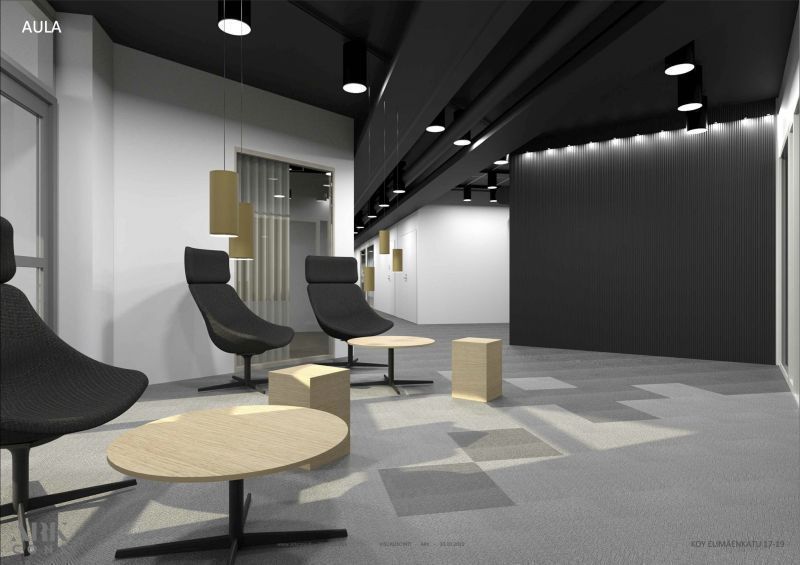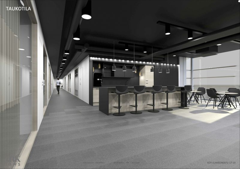 Tilassa on useita viihtyisiä lounge- ja taukotiloja, jotka toimivat luontevina kohtaamispaikkoina henkilöstölle. Runsas luonnonvalo ja selkeä tilajako luovat miellyttävän ja inspiroivan työympäristön. Kokonaisuus on myös muokattavissa käyttäjän tarpeiden mukaan, mahdollistaen yritykselle juuri oman näköisen toteutuksen.
