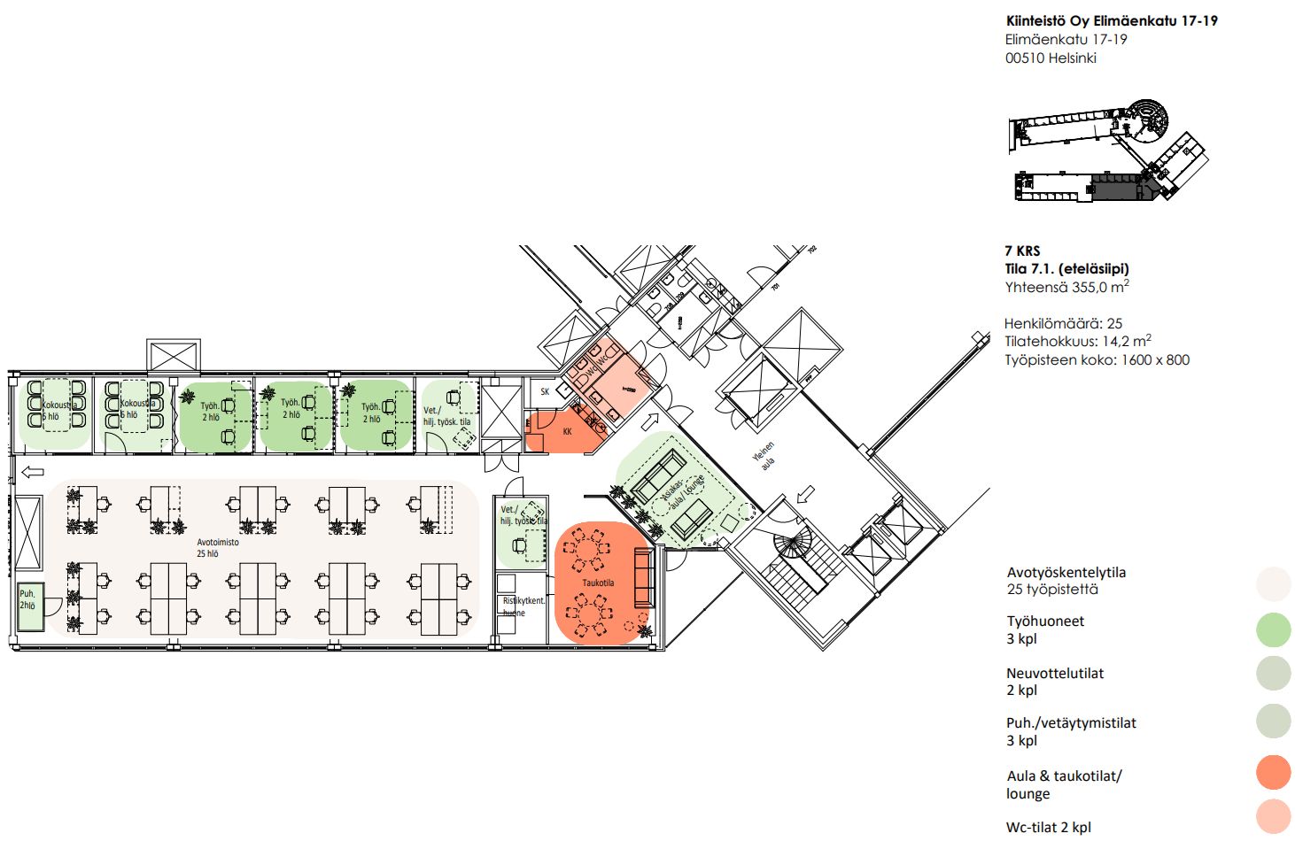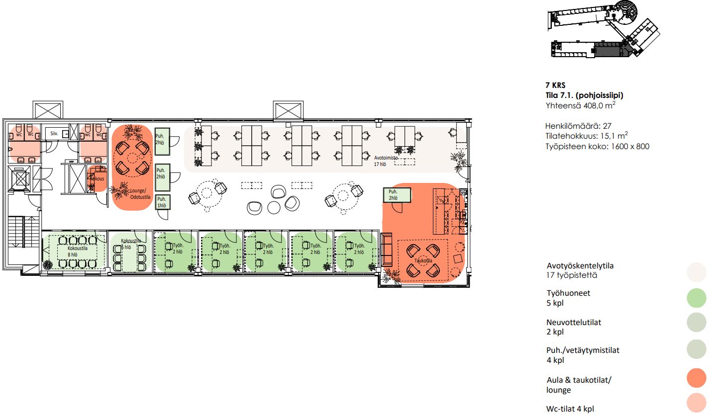 Tilakokonaisuus koostuu kahdesta siivestä. Avarat avotyöskentelyalueet yhdistyvät useisiin työhuoneisiin, neuvottelutiloihin sekä vetäytymis- ja hiljaisen työn tiloihin. Pohjaratkaisu tukee modernia hybridityöskentelyä ja mahdollistaa sekä tehokkaan yhteistyön että rauhallisen keskittymisen.