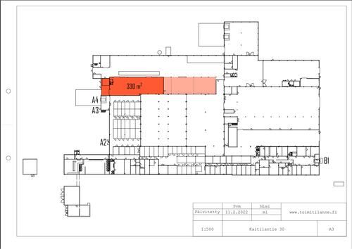 Vuokrataan Orimattilasta katutason 330 m² tuotanto- tai varastotila. Varastohallin korkeus on 7 m. Lastauslaiturin ovikorkeus 2,45 m. Sisäänajomahdollisuus. Oven edustalla on yksi lattiakaivo. Halliin on helppo liittää tarvittava määrä lisätilaa n. 500 m² asti, merkitty pohjakuvaan vaaleammalla värillä.