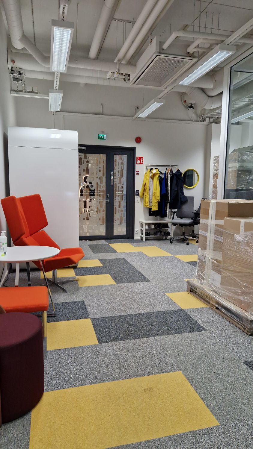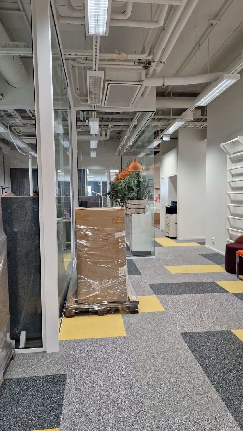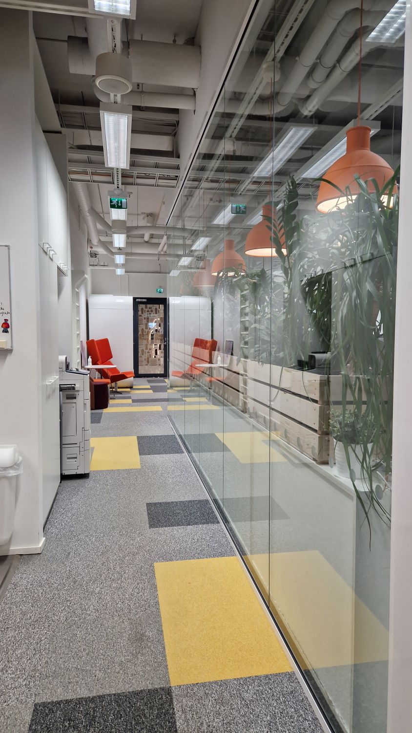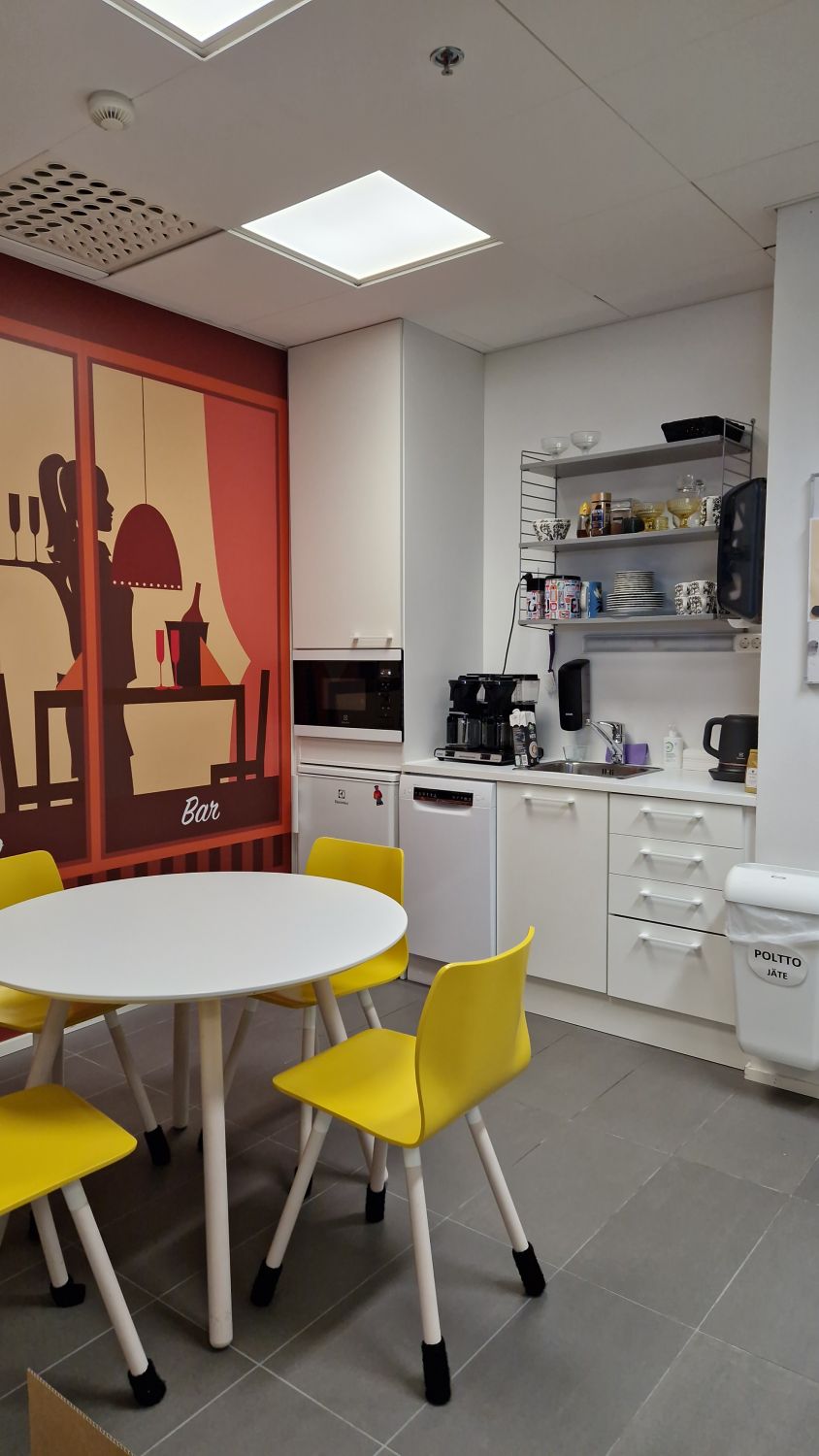 Toimistossa on oma keittiövarustus, 2 kpl wc-tilaa, neukkarihuone sekä lasiseinällä eriytetty useamman työpisteen tila.
