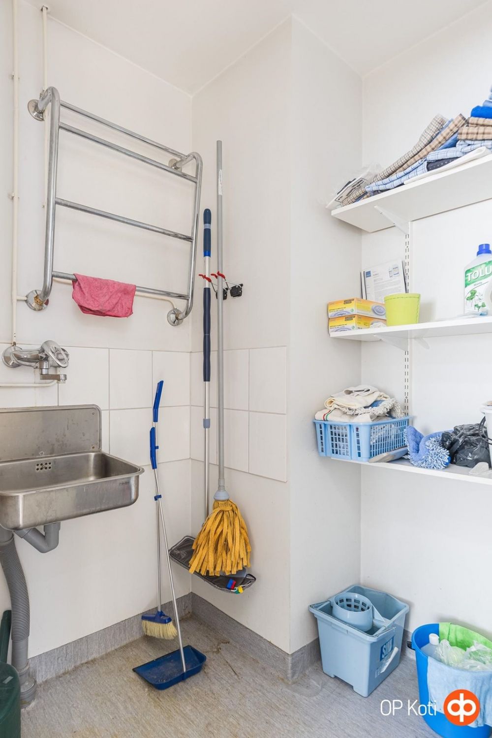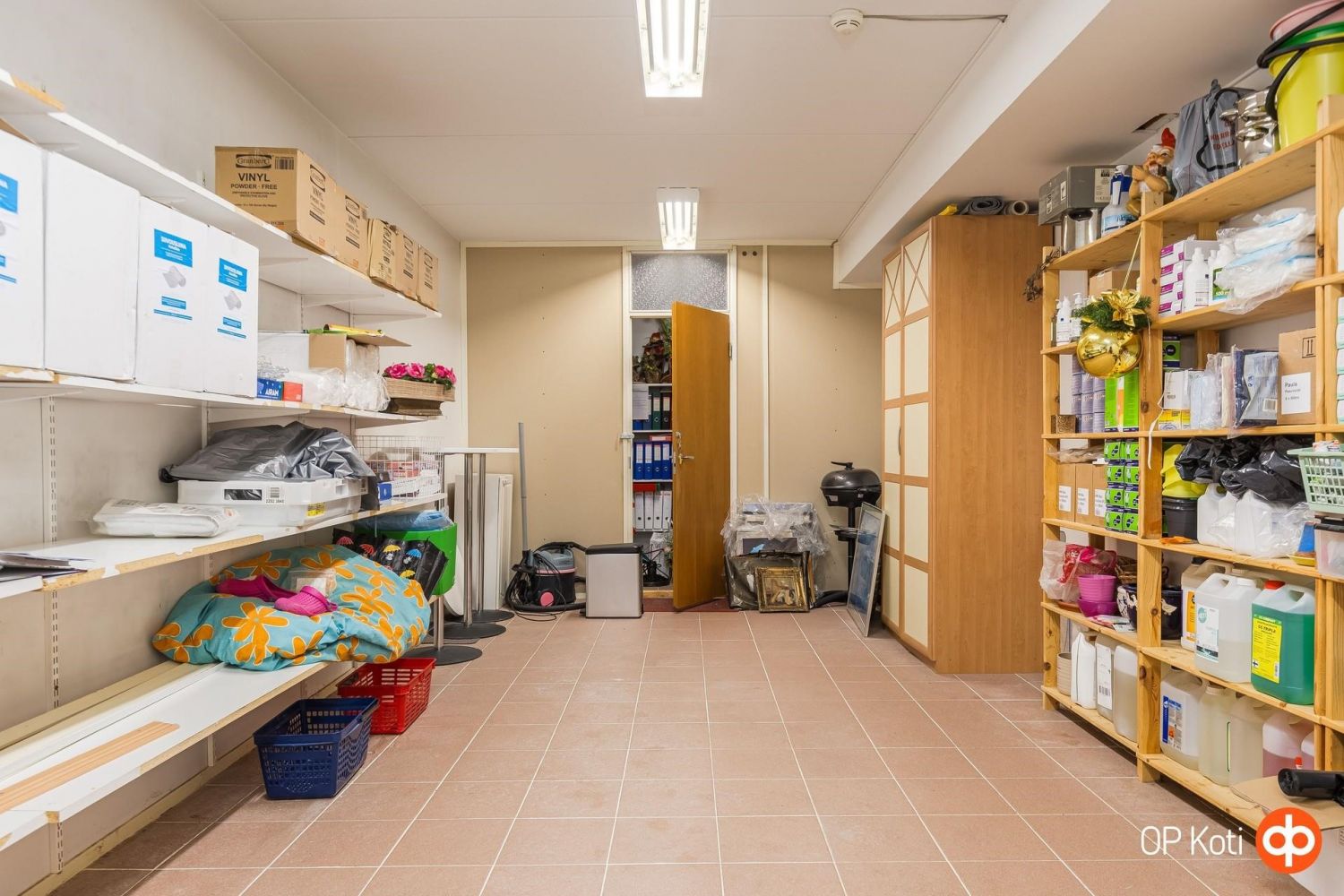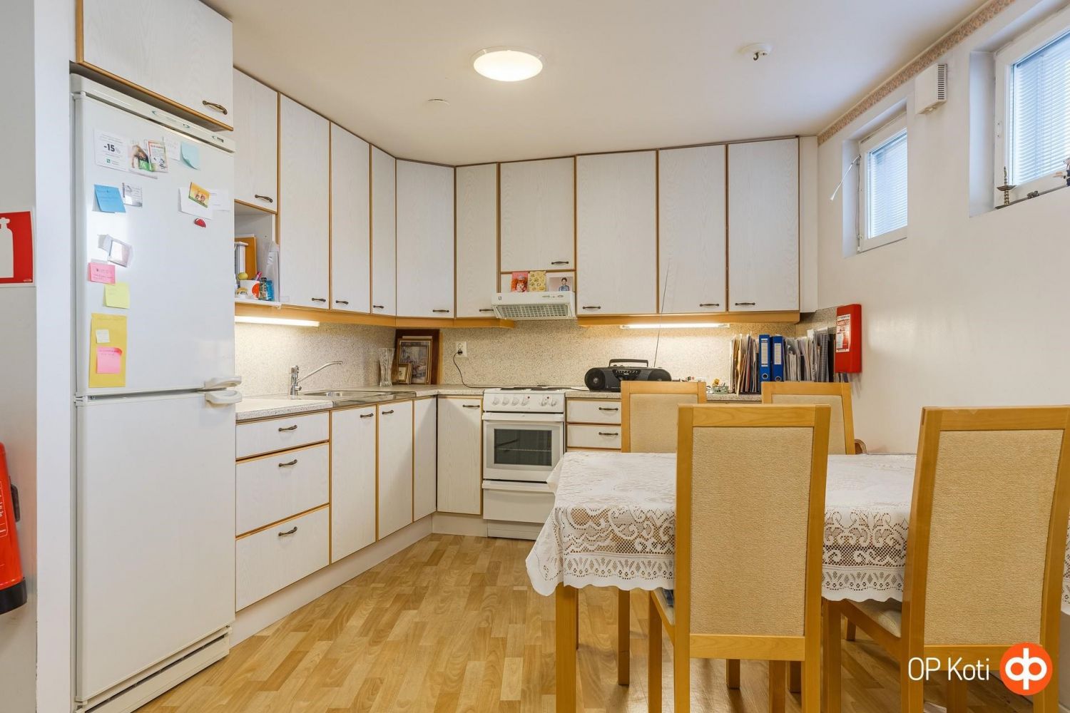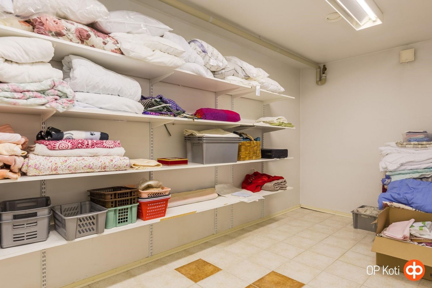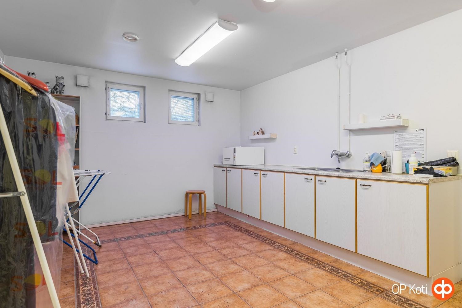 Siivouskomeroita 2kpl. Alakerta: eteishalli/porraskäytävä, pyykkihuone ja varastohuone, varastotila, tekninen tila, kylpyhuone ja lepo/toimistohuone jossa myös keittiö jääkaappeineen.