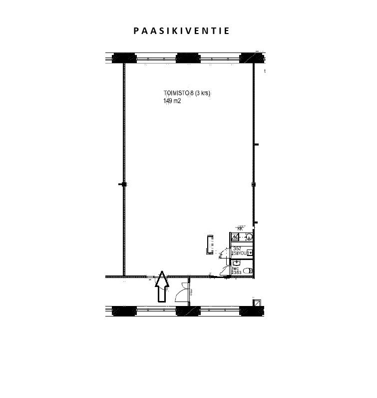 149m2 kokoinen toimisto on avotilaa, lisäksi keittiönurkkaus, wc ja siivouskomero.