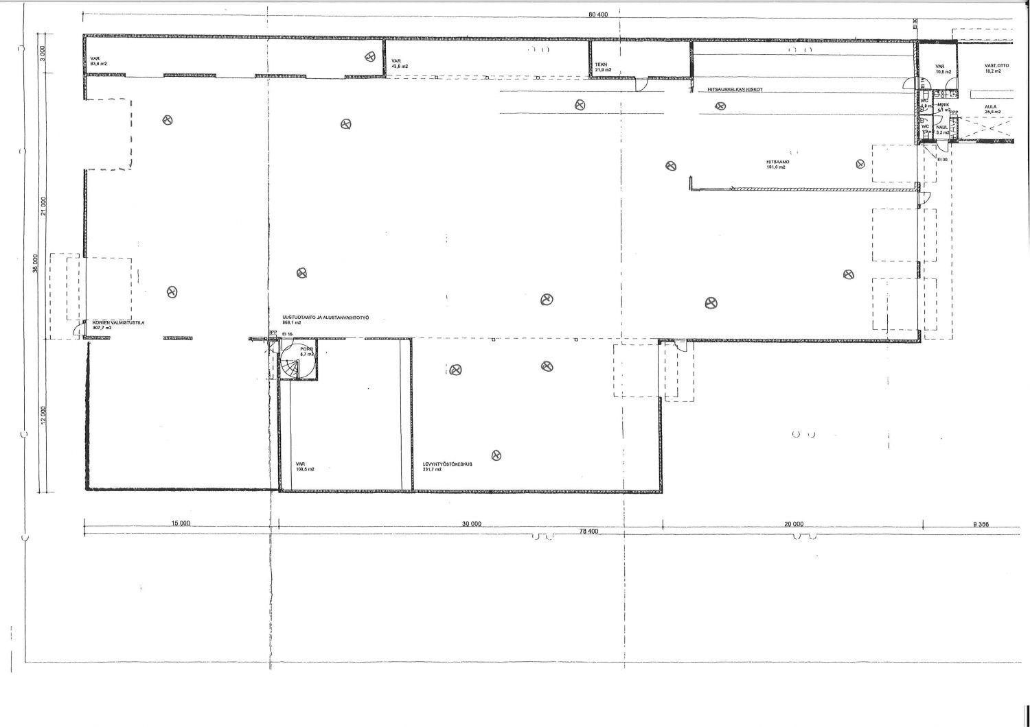Hallissa on runsaasti lattiakaivoja. Hallin korkeus on n. 6m, päänosto-ovet 4,5m x 5,0m, taiteovet toisessa päädyssä 5,5m x 5,0m. Tontilla 2 omaa sähkömuuntamoa.