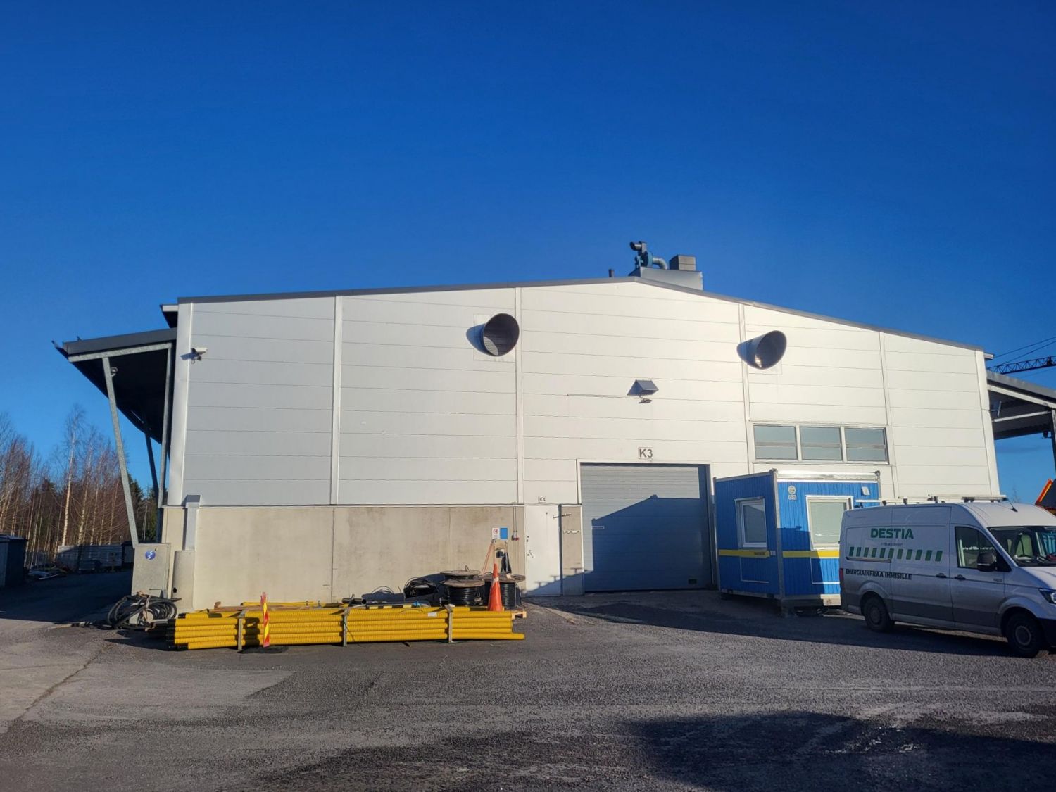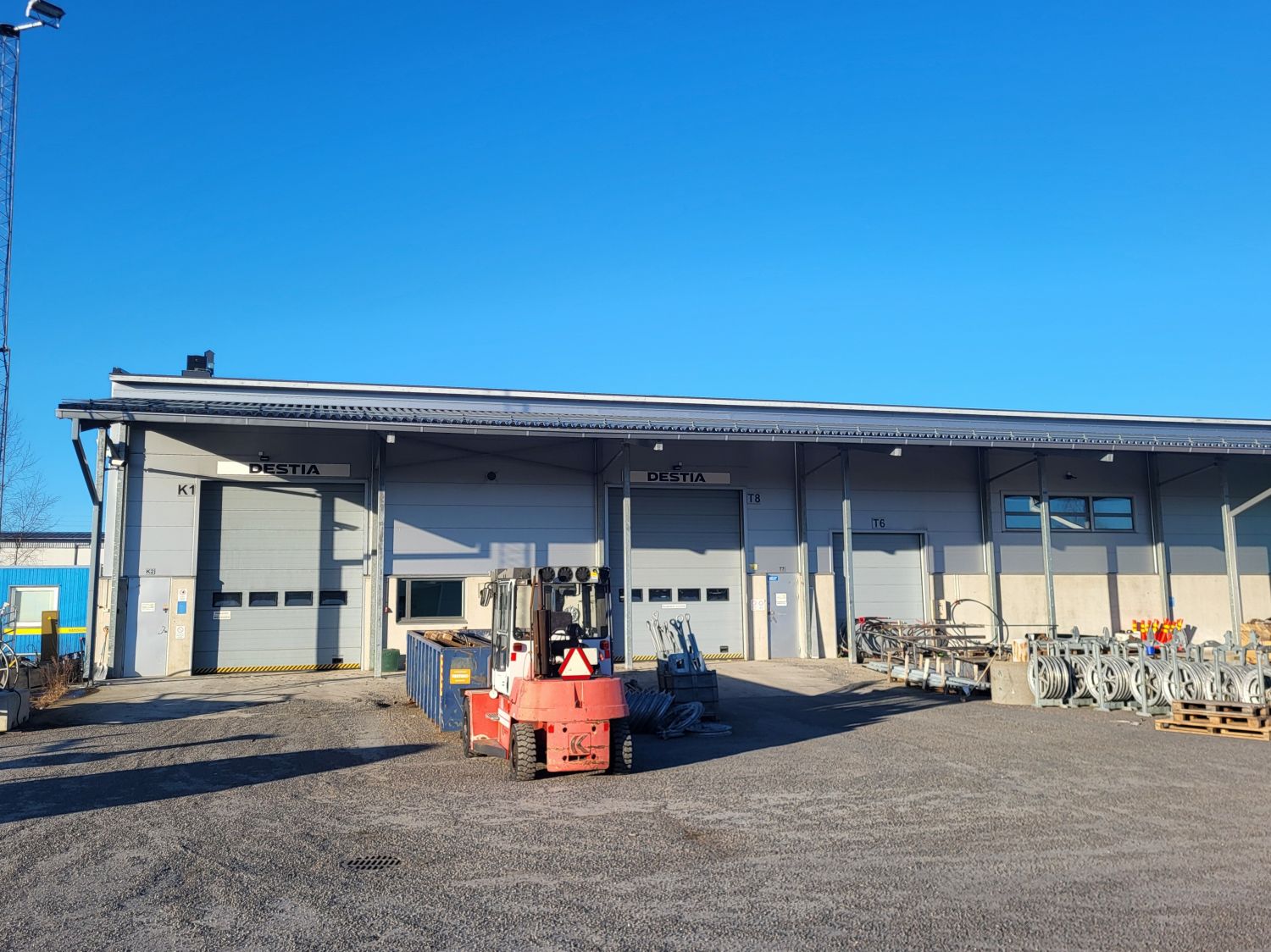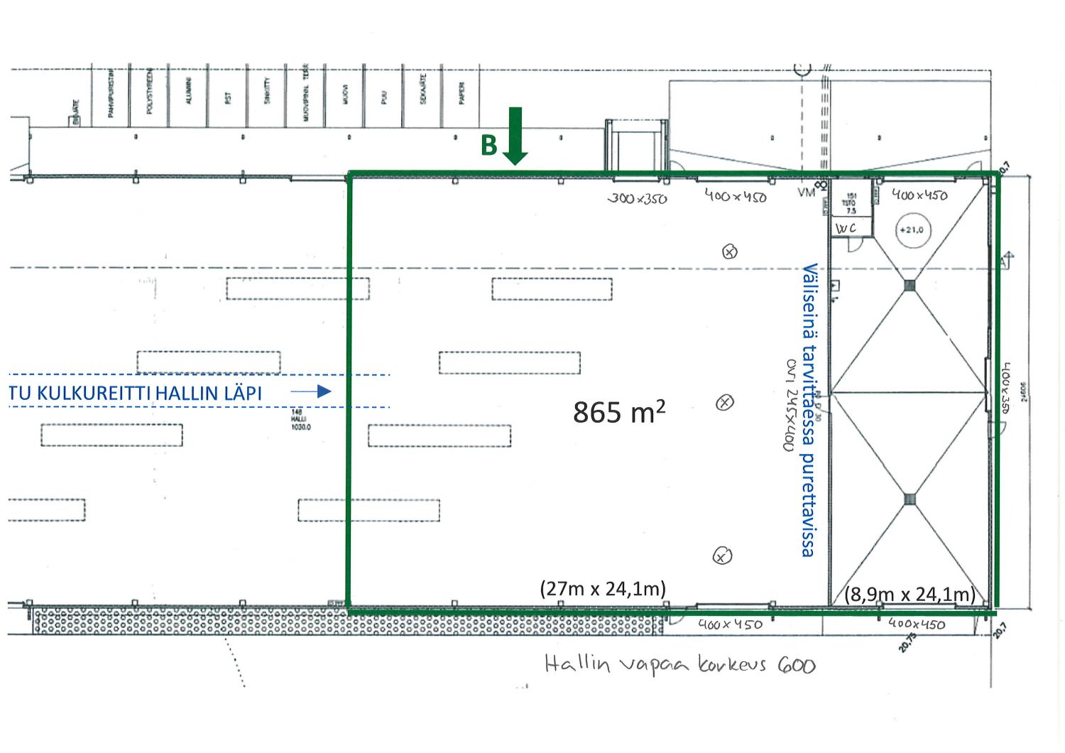 Hallin vapaa korkeus on 6m ja nosto-ovia on jokaisella sivulla. Väliseinän korkeus on 4m ja se on myös purettavissa.