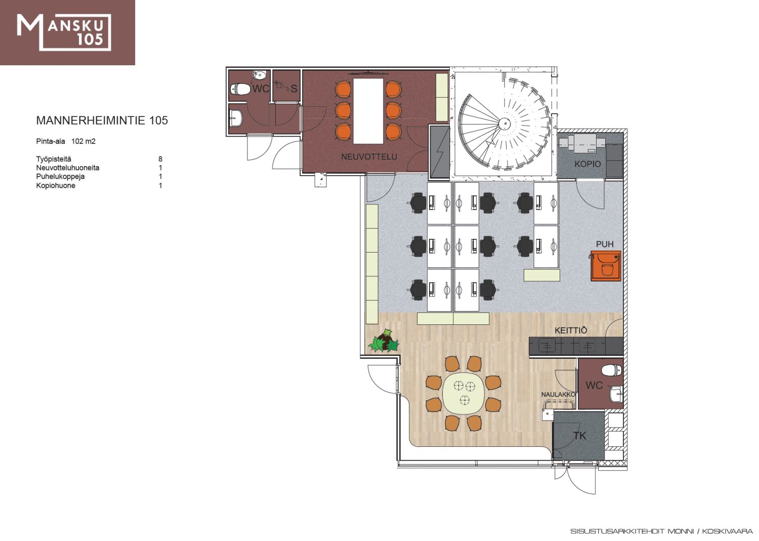 Helsingin Mannerheimintie 105 on moderni toimistokiinteistö näkyvällä ja helposti saavutettavalla paikalla Mannerheimintien loppupäässä Ruskeasuolla. Työmatkaliikenne tähän kohteeseen on varsin vaivatonta pääkaupunkiseudun asuinalueilta, sillä lukuisat bussit kulkevat talon edestä Mannerheimintieltä. Myös raitiovaunulinja 10:n pysäkki on talon kulmalla. Autolla Mansku105:een on kätevää tulla, sillä se sijaitsee pääväylien risteyskohdassa. Autonkin saa helposti parkkiin talon alla sijaitsevaan pysäköintihalliin.