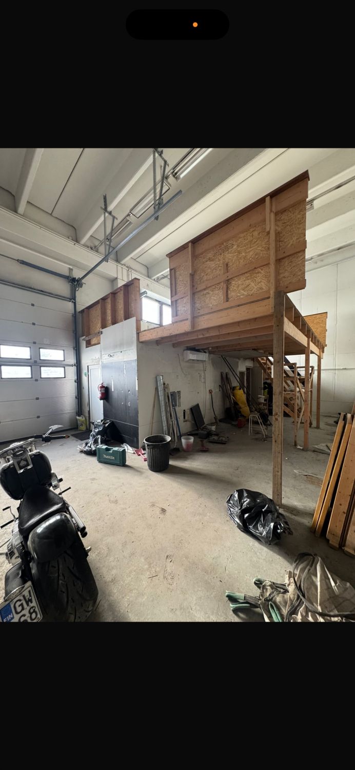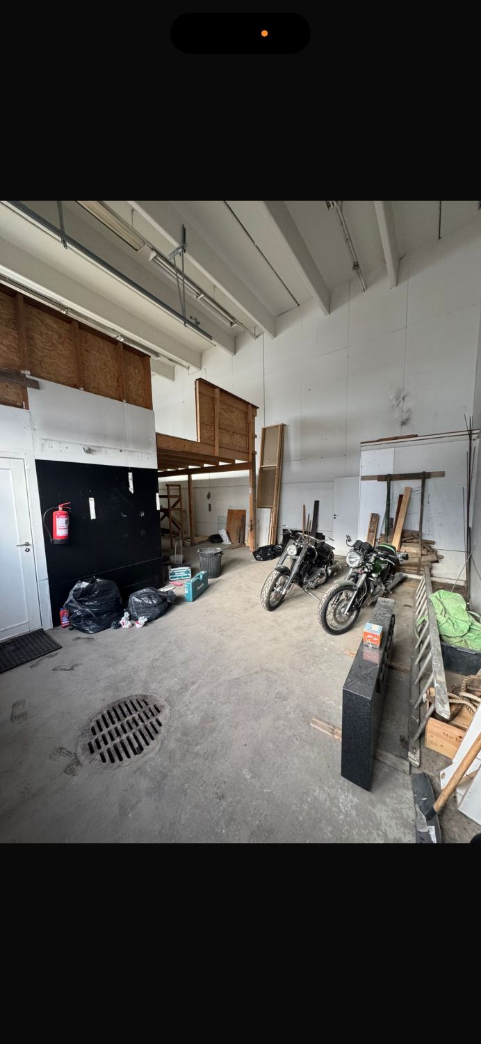 Tilassa suuri nosto-ovi, lattiakaivo sekä parvi. Tilan edessä merkityt parkkipaikat.