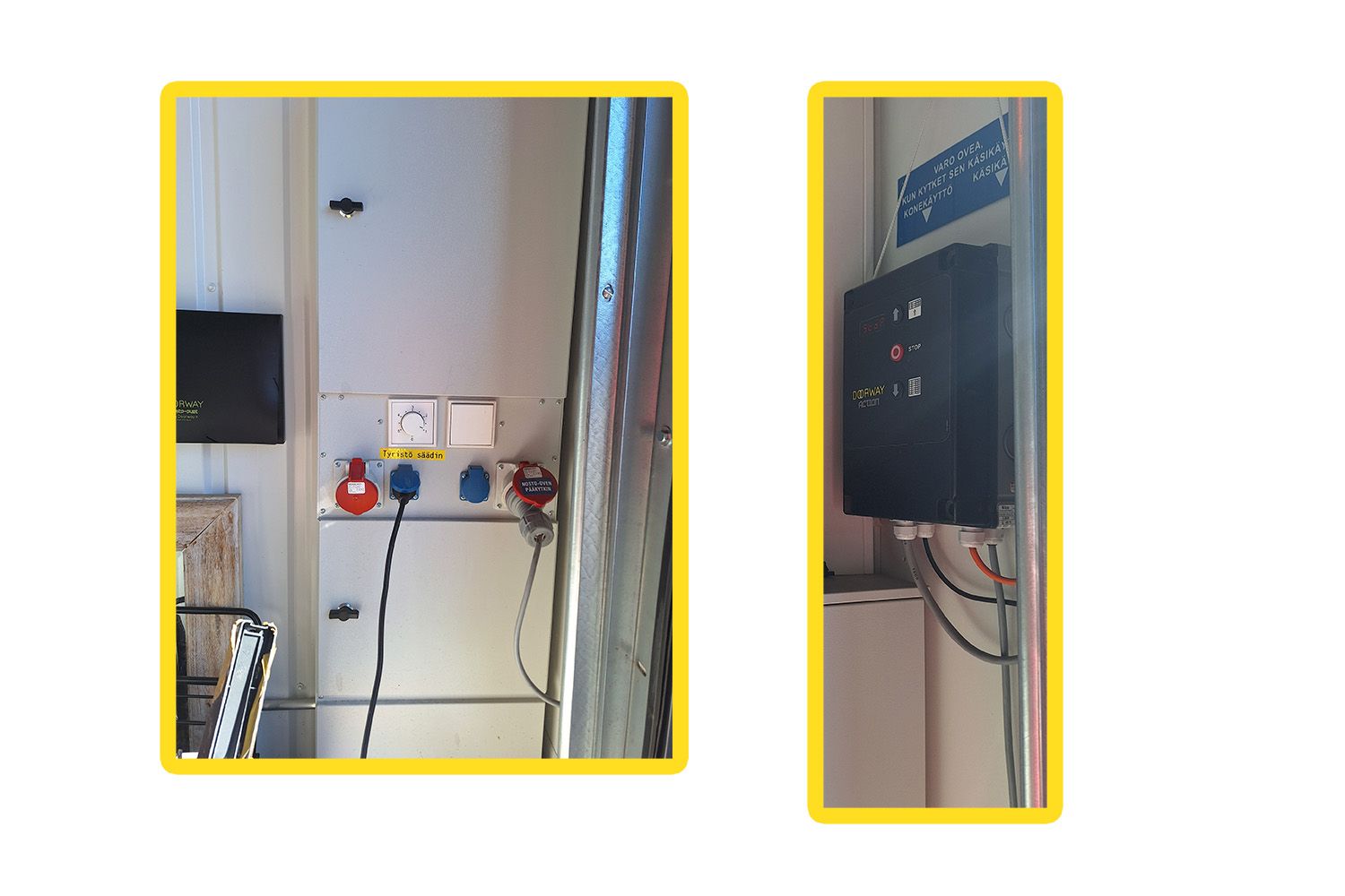 Tilassa on sähkökäyttöinen ja käyntiovella varustettu nosto-ovi (L 3,5 m x K 3,8 m). Nosto-oveen on kaukosäädin. Hallin varusteluun kuuluu lisäksi voimavirta, lattiakaivo hiekan- ja öljynerotuksella sekä vesipiste ja wc.