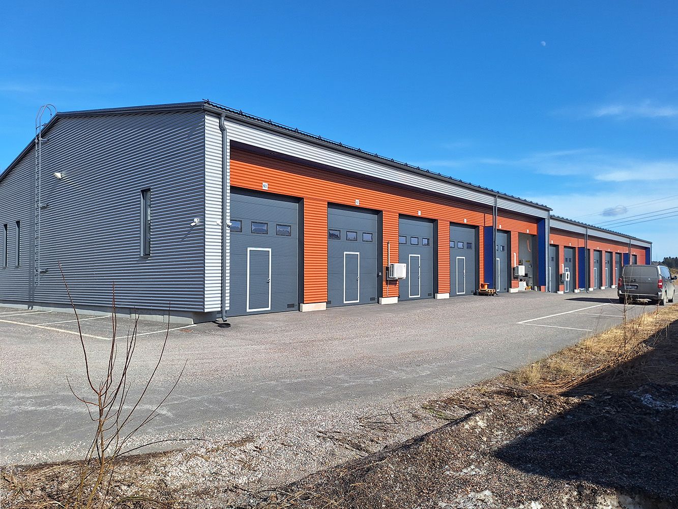 Hallirakennuksen ympäri pääsee ajamaan kätevästi autolla, joten esimerkiksi tavaroiden lastaus ja purku onnistuvat helposti. Hallitilan siisti piha-alue on asfaltoitu. Alueella on myös kameravalvonta.