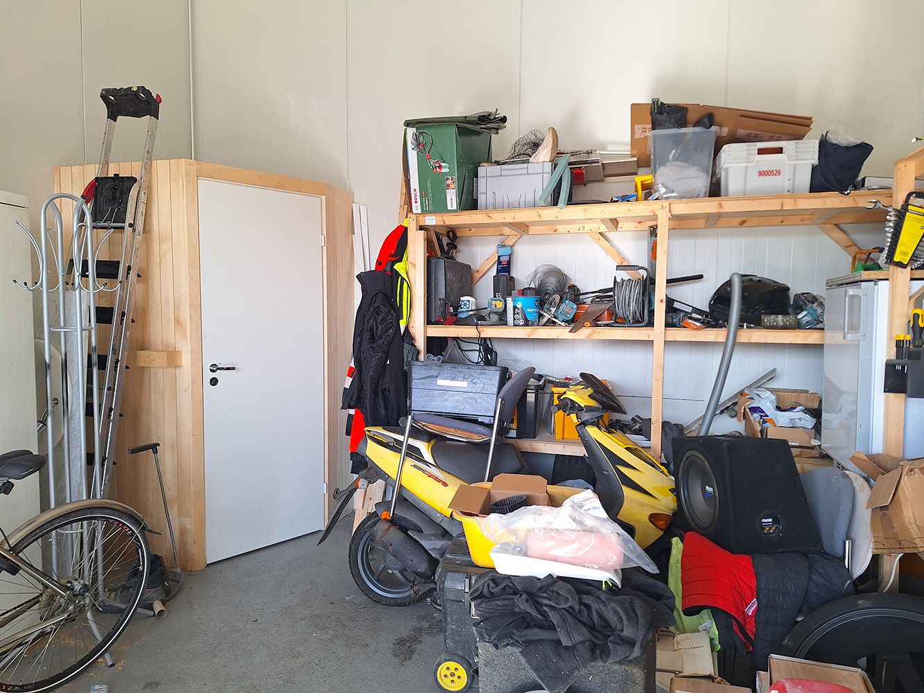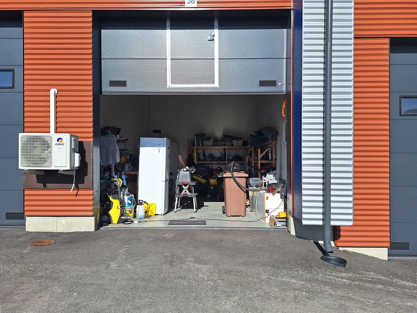 Kunto, varusteet ja palvelut: Nosto-ovi käyntiovella (sähkökäyttöinen kaukosäätimellä), lattiakaivo hiekan ja öljyn erotuksella, voimavirta, wc ja vesipiste