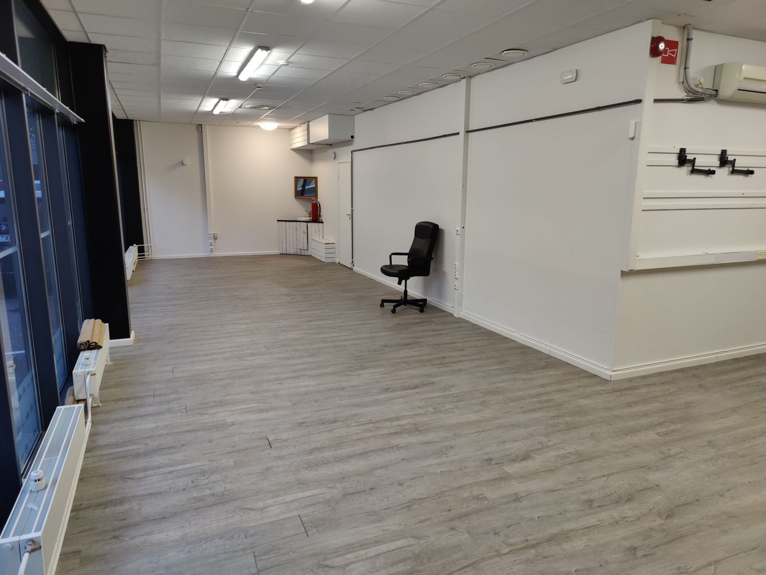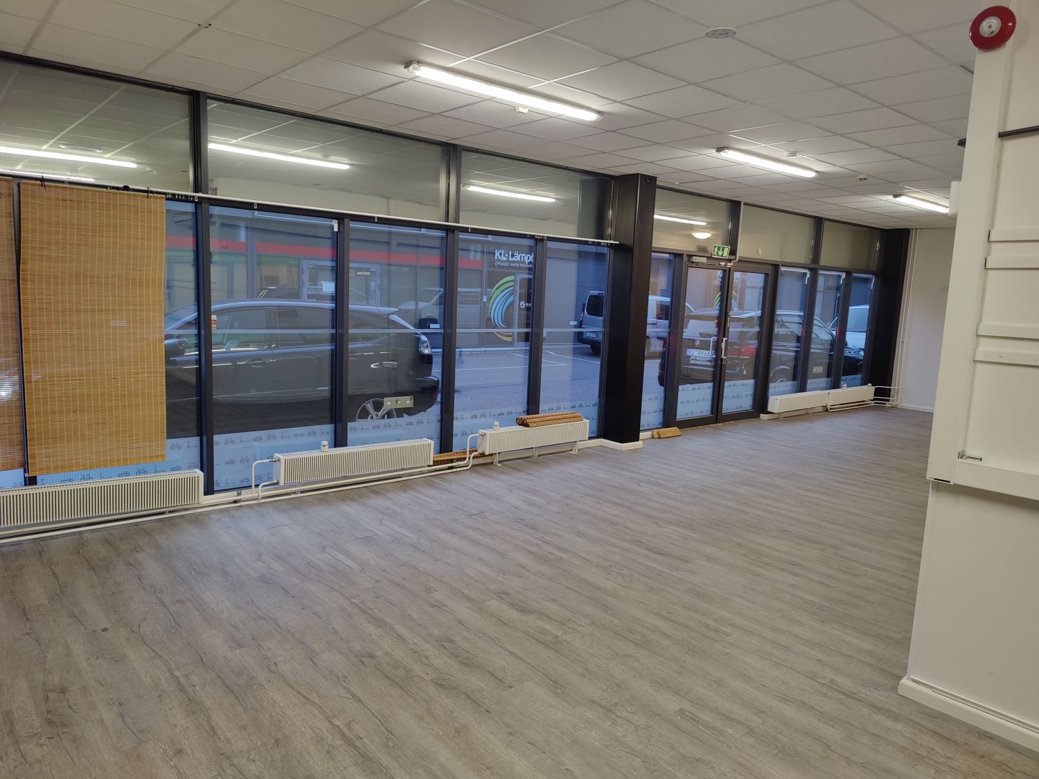 L-muotoinen tila, laminaattilattia, jäähdytys, isot ikkunat joissa verhot, oma sisäänkäynti ulkoa, sisäänkäynnin edessä 2 oma parkkipaikkaa.