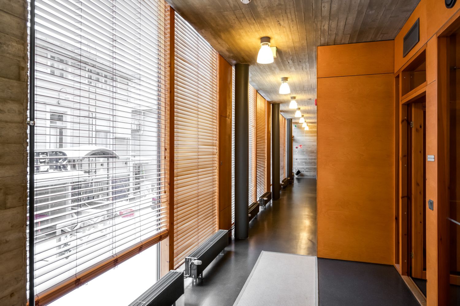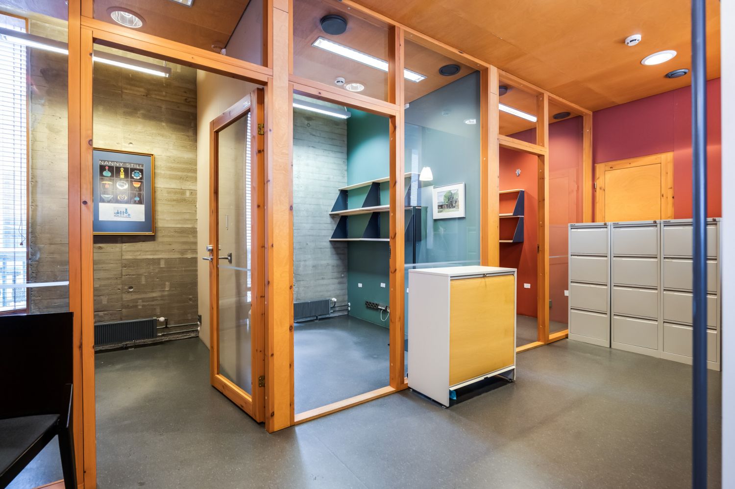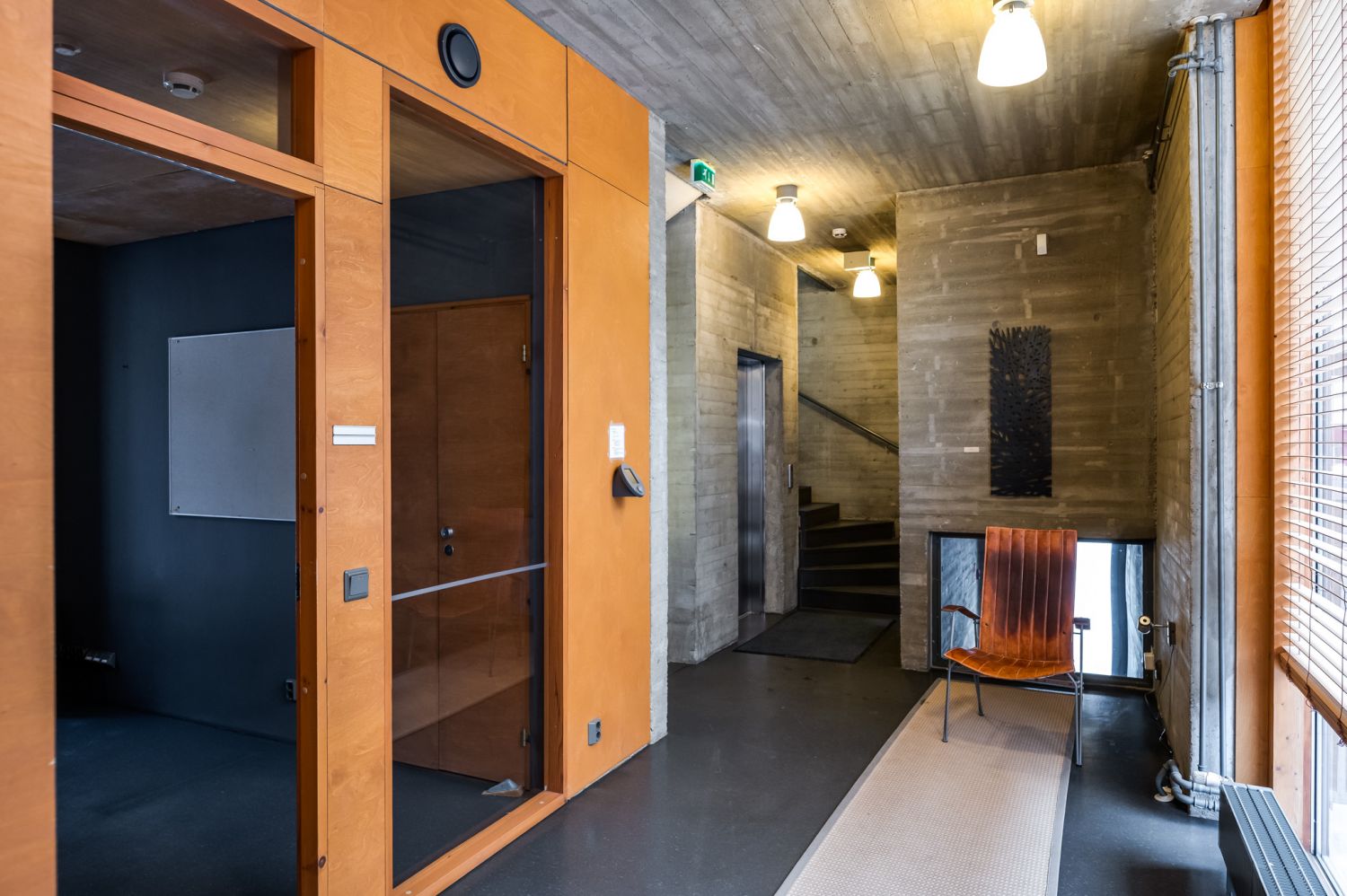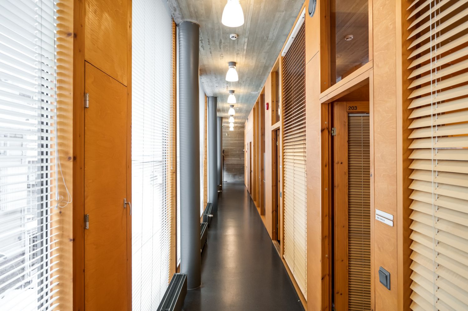 Huoneiden seinät ovat puukuitulevyä ja pääsoin betonipintaa. Kerroksia yhdistää korkea taukokahvila-aulatila.