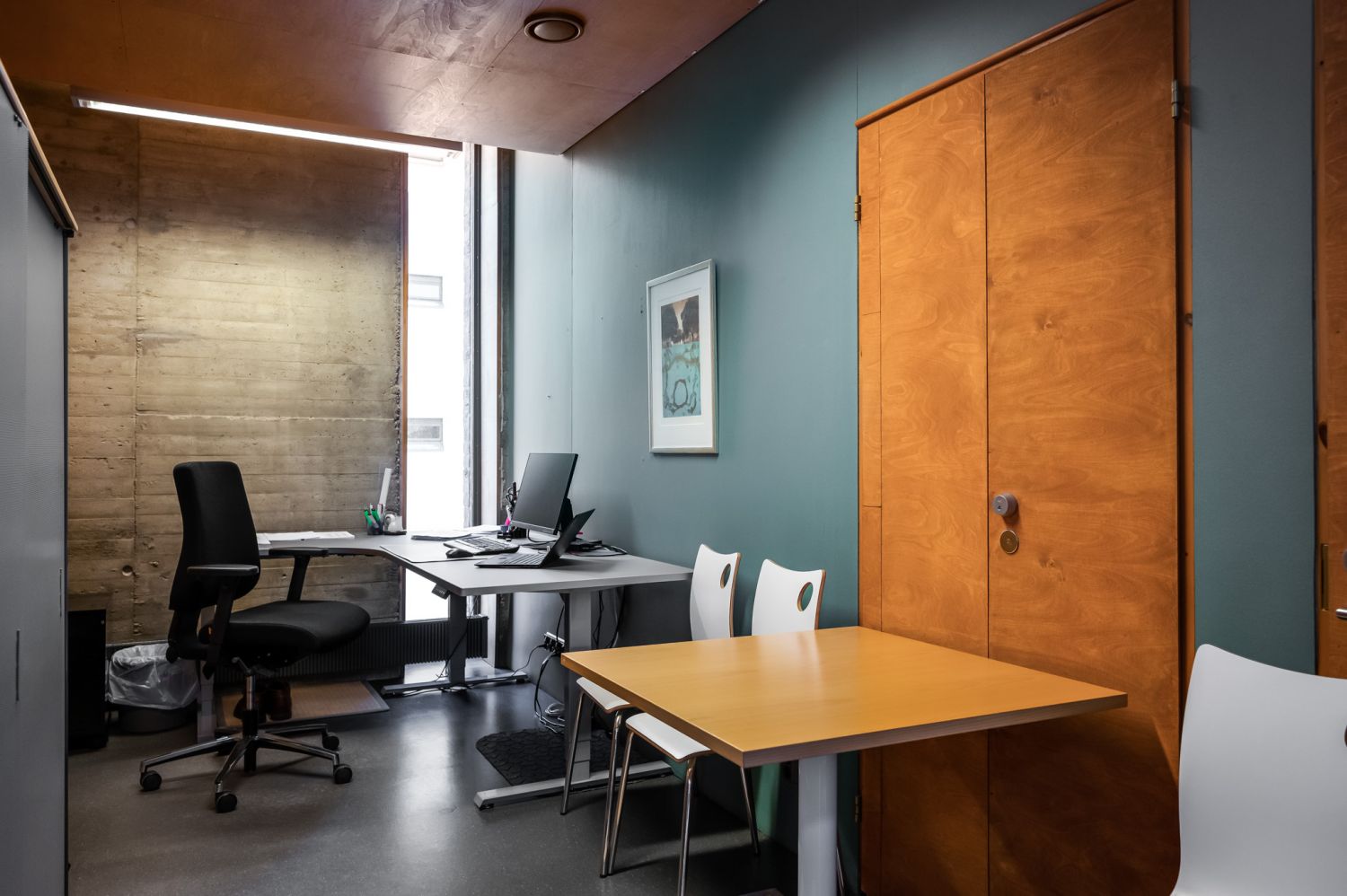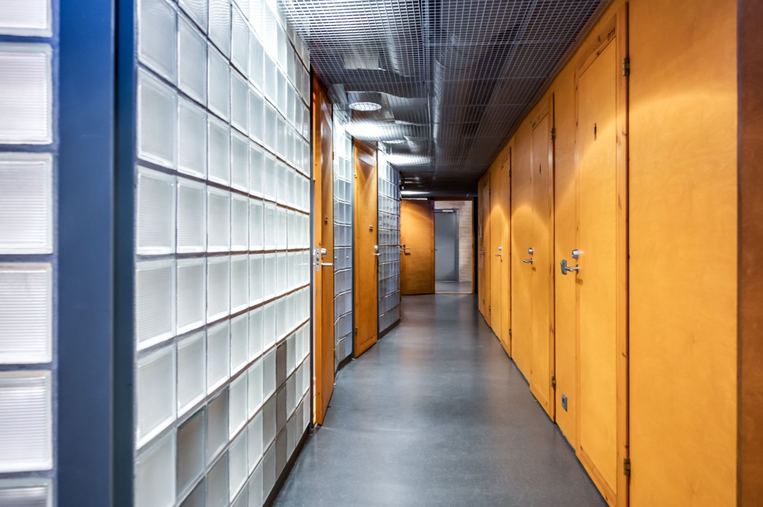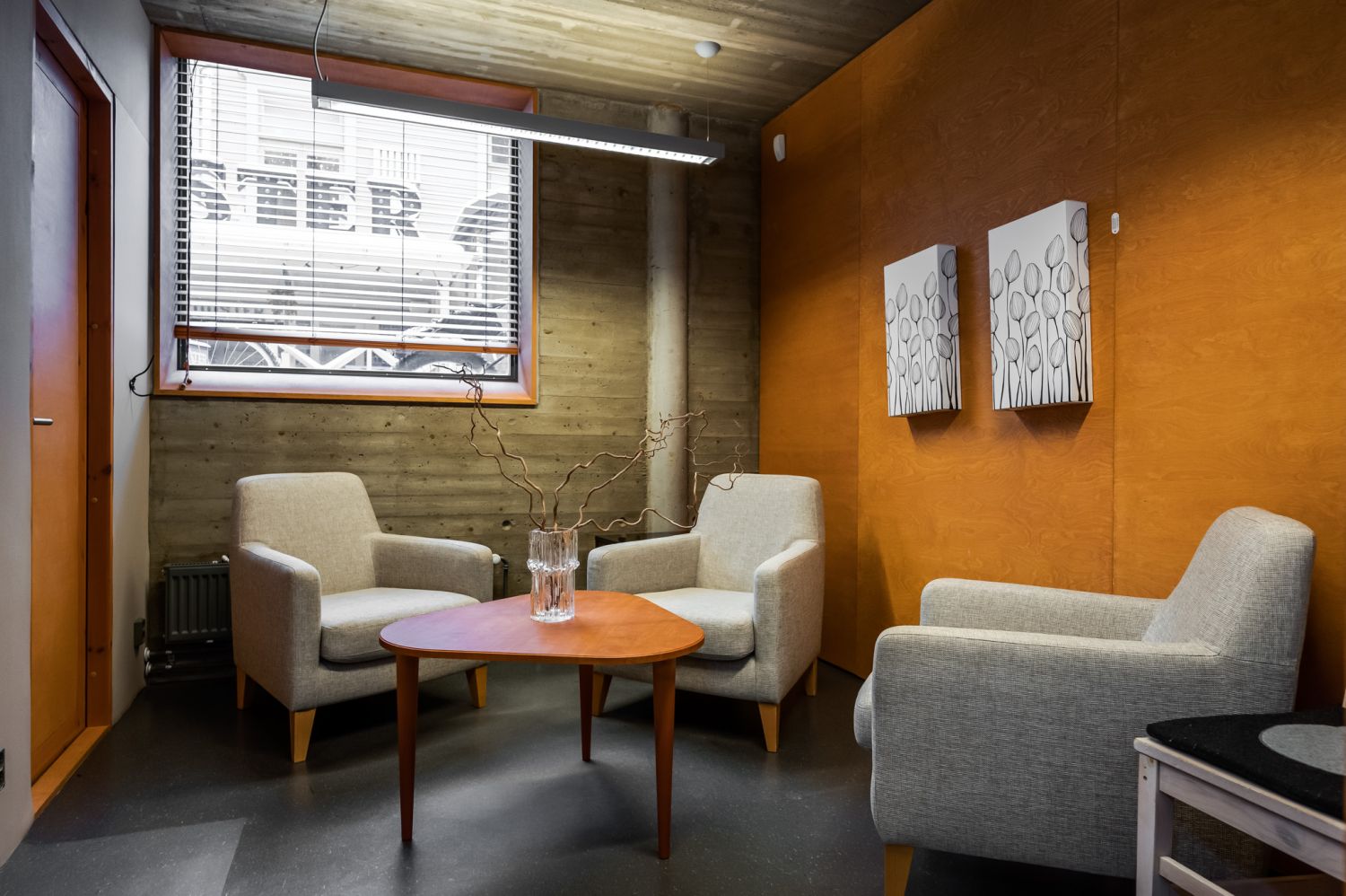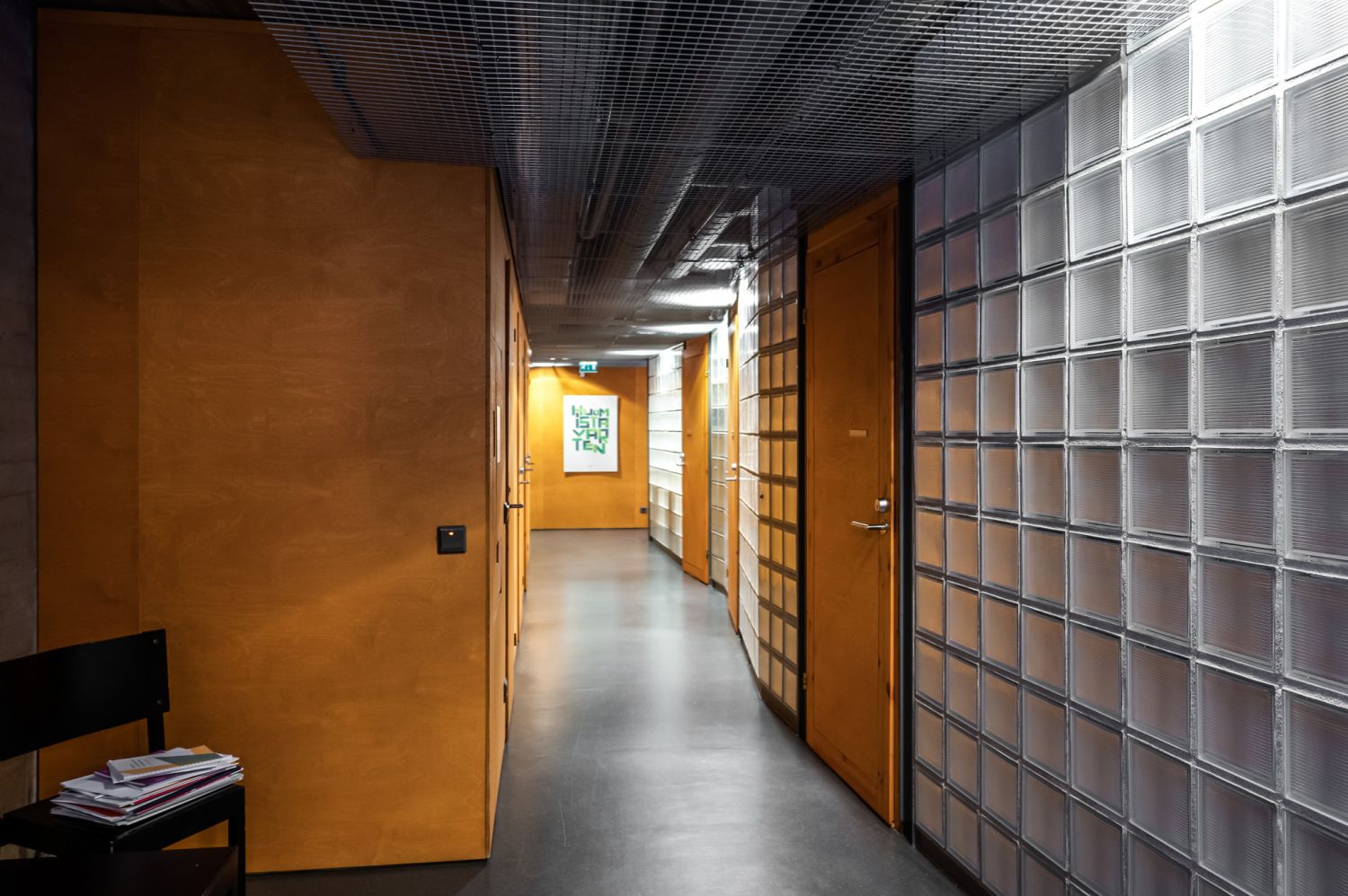 Huoneiden seinät ovat puukuitulevyä ja pääsoin betonipintaa. Kerroksia yhdistää korkea taukokahvila-aulatila.