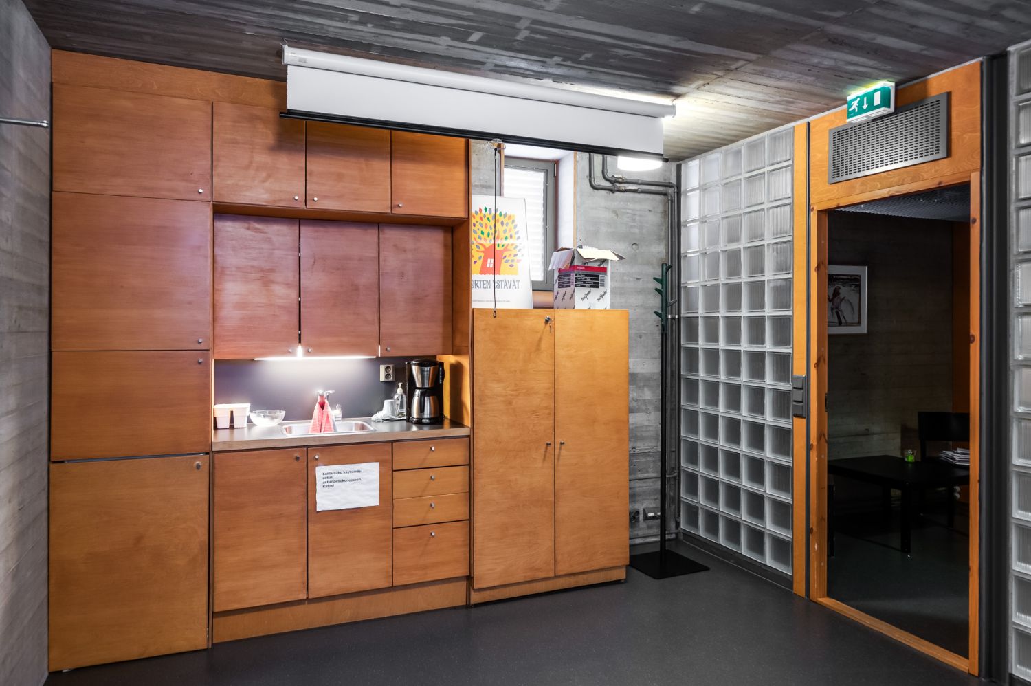 ** n. 83 m2 Pohjakerroksessa on keittiö/ taukotila, sekä toimisto/neukkaritilaa. Tila on keskiosaltaan taukotilan kohdalta kokonaan avoin ylös 2. kerrokseen asti.