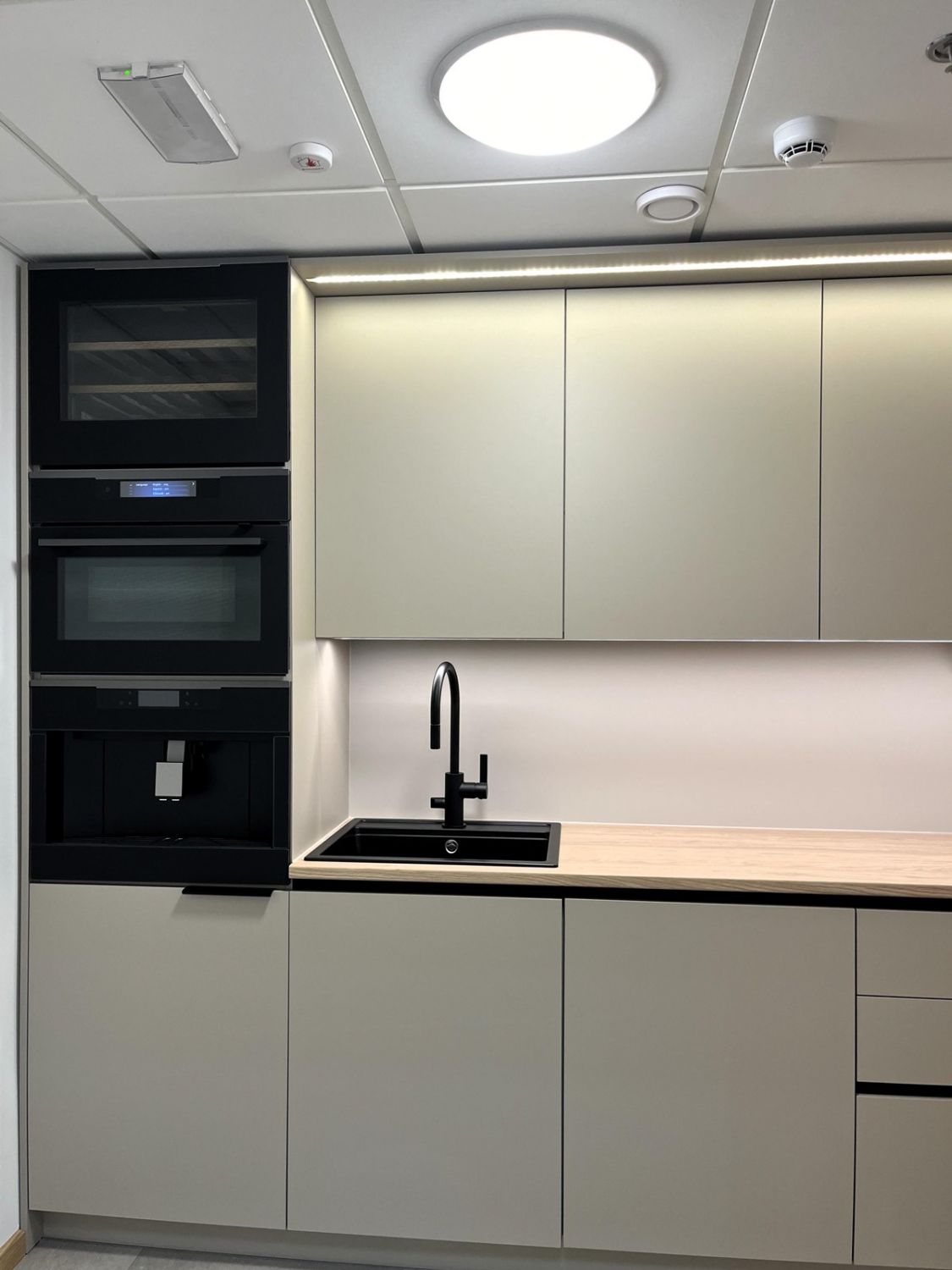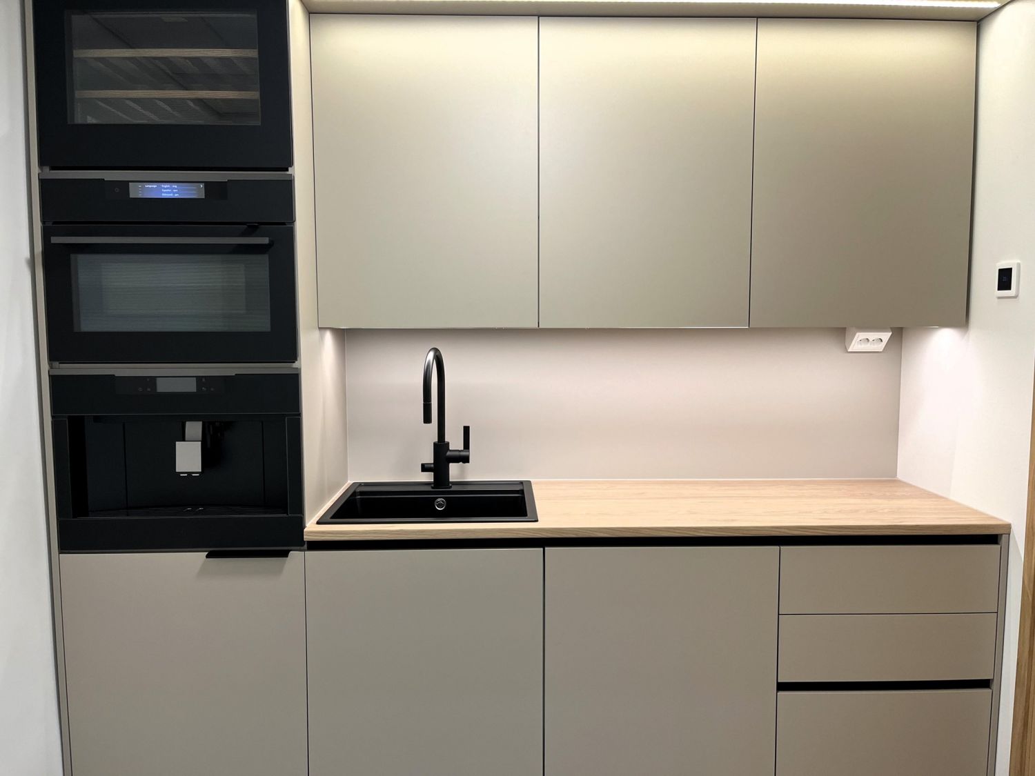 Tasokkaassa keittiössä mm. kaluste uuni, viinikaappi ja kahvinkeitin.