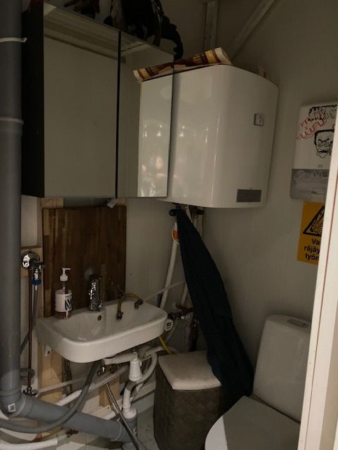 Lattiakaivo öljynerottimella. WC ja lavuaari. Voimavirtapistoke. Tilaan tulee kylmä vesi, ja lämminvesivaraaja löytyy. Lämmitys sähköpattereita ja ilmalämpöpumppu.
