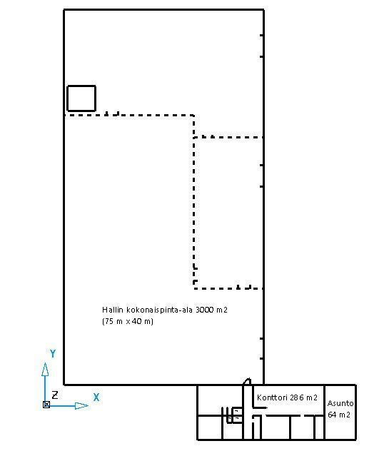 Hyvällä paikalla sijaitseva varasto-/teollisuushalli 3000 m2 ja erillinen toimisto (johon sisältyy asunto 64 m2) noin 3500 m2. Halli jaettu nyt kolmeen osaan, mahdollista muuntaa yhdeksi isoksi tilaksi. Kaukolämpö, sprinkleri, oma sähkömuuntamo, 3 suurta nosto-ovea ja useita pylväsnostureita. Hallin korkeus keskellä 10 metriä, laidoilla noin 6 metriä. Tilassa lattiakaivot, ei kuitenkaan öljynerotuskaivoja. Suuri asfaltoitu piha-alue, kaupungin vuokratontti pitkällä sopimuksella. Edullinen hinta. Soita ja kysy lisää.