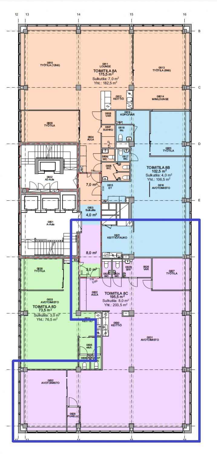 A-portaan 8. kerroksen toimisto tarjoaa edustavat ja toimivat puitteet moderniin työskentelyyn. Tila muodostuu valoisasta ja avarasta avotilasta, jossa kaksi osiota on luontevasti rajattu erillisiksi työtiloiksi esimerkiksi tiimityöhön tai rauhallisempaan työskentelyyn. Käytännöllinen avokeittiö tukee sujuvaa arkea ja viihtyvyyttä, ja tiloissa on kaksi wc:tä sekä erillinen siivous- ja varastotila. Ikkunat tuovat runsaasti luonnonvaloa ja tarjoavat avarat näkymät. Tilan kokonaispinta-ala on 203,5 m², josta varsinaista toimistotilaa on 195,5 m² ja lisäksi 8 m² jyvitettyä osuutta yhteiskäyttöisestä kerrosaulan sulkutilasta.