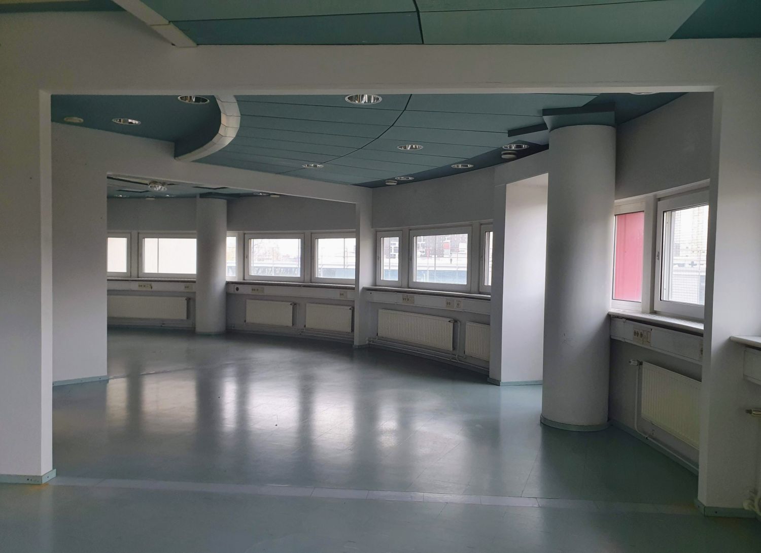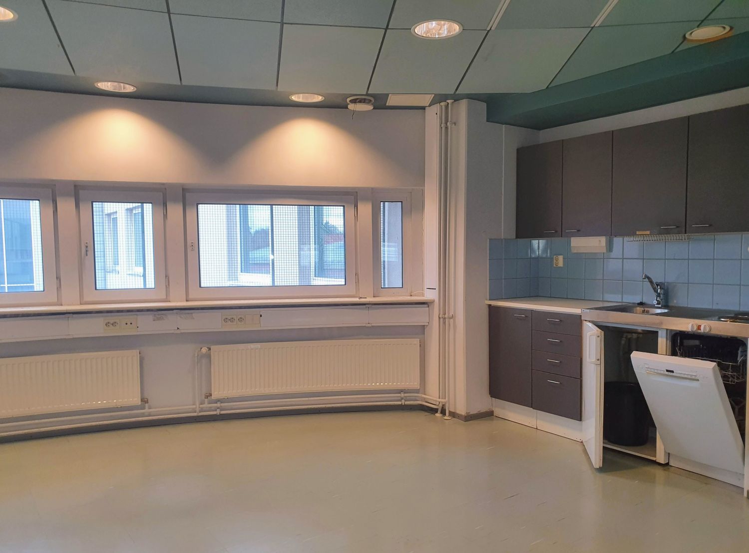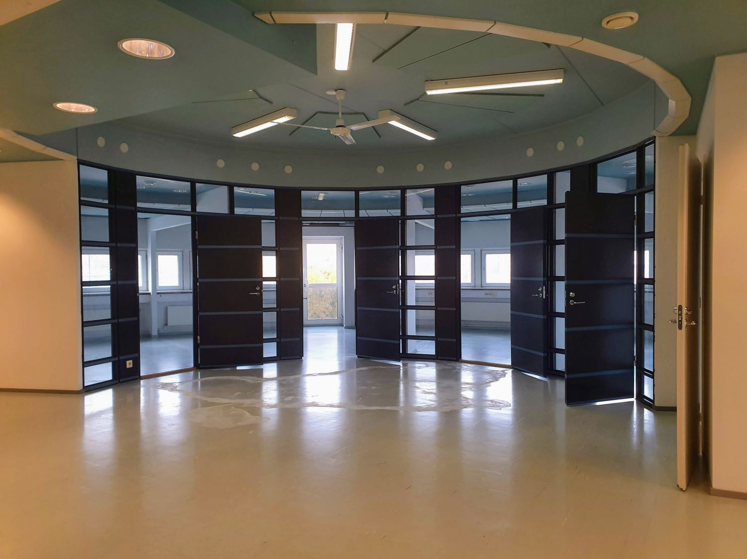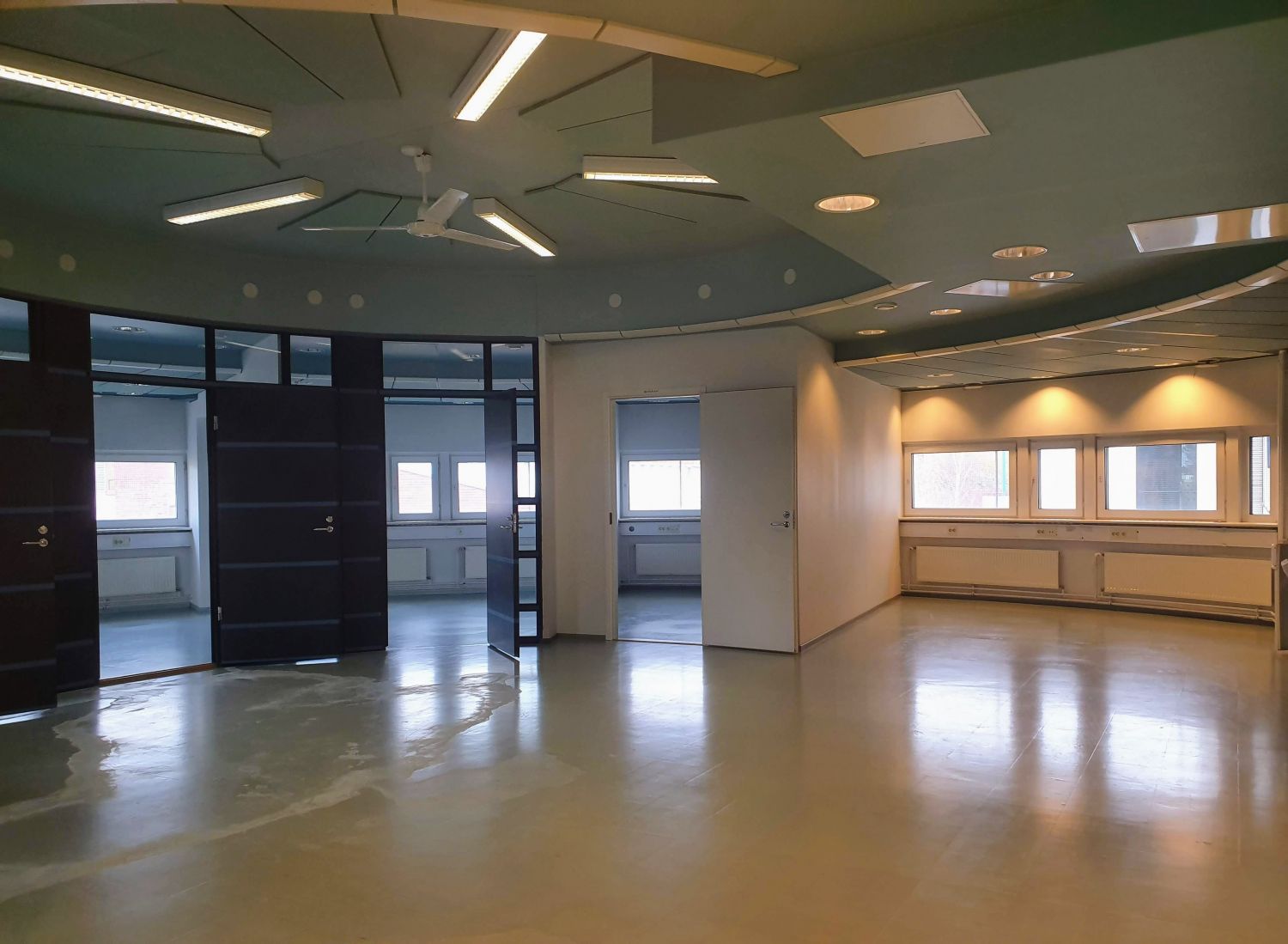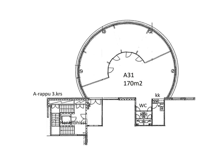 Tässä erikoisen mallisessa toimistotilassa on iso avotila, jossa keittiö sekä eteinen. Lisäksi iso kaarevan mallinen työhuone, joka jaettavissa 1-4 pienemmäksi työhuoneeksi. Kokonaisuuteen kuuluu myös 2 x wc-tilaa.