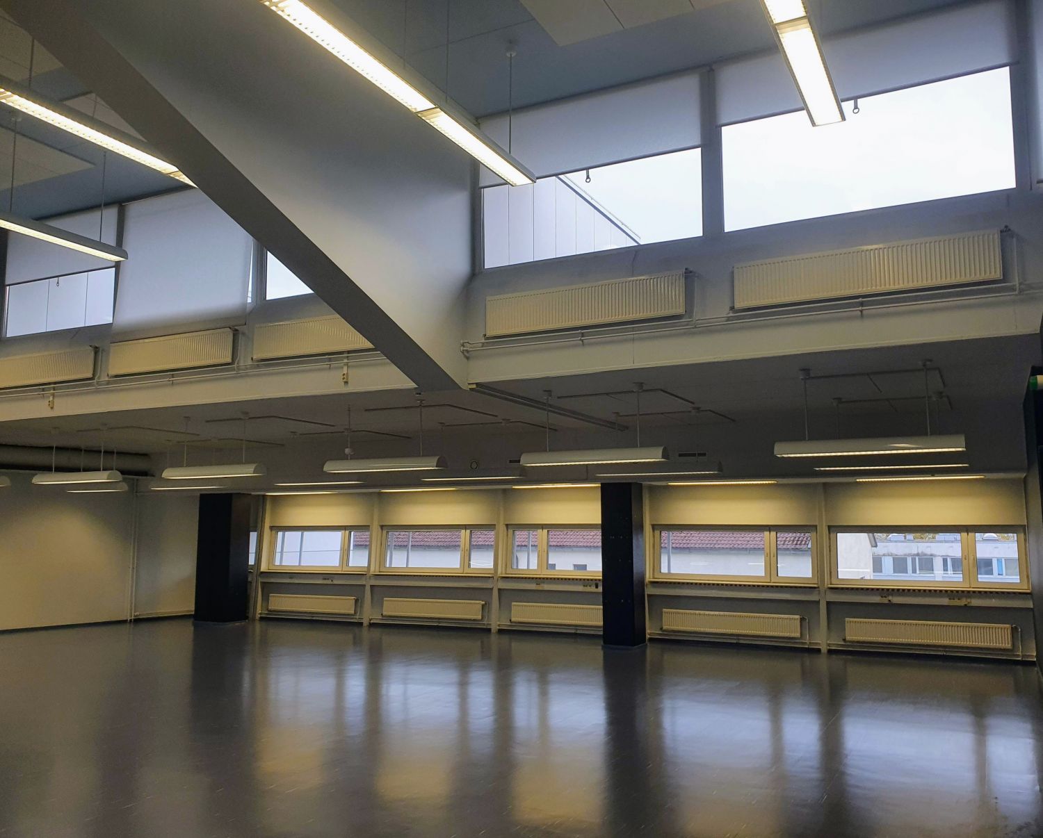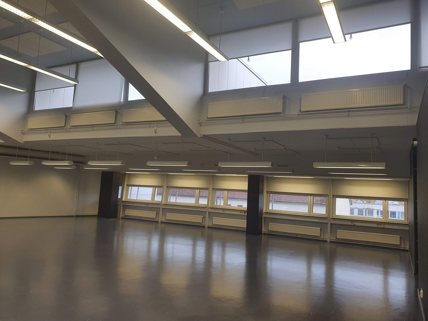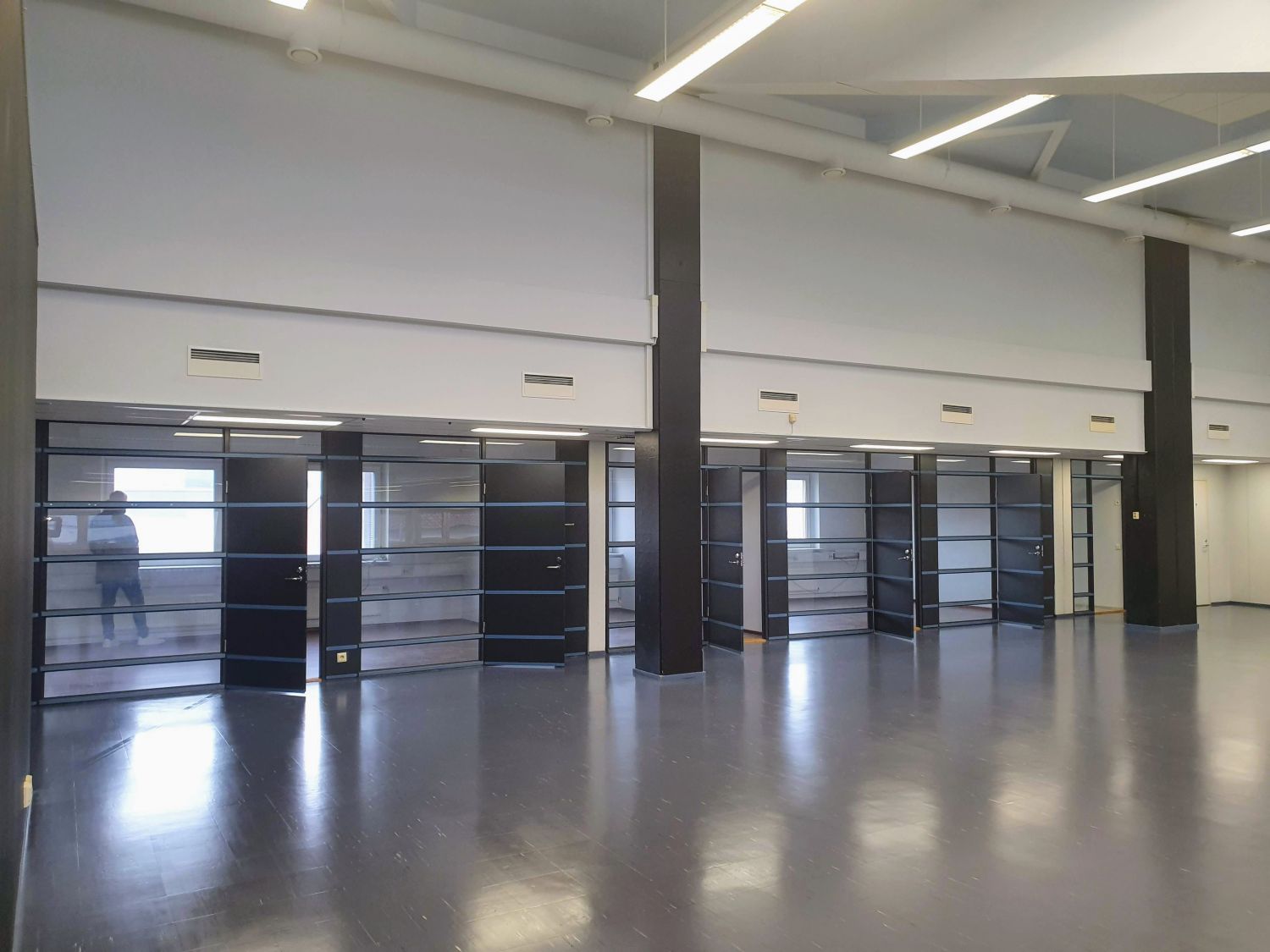 Erittäin korkean ison avotilan lisäksi tilakokonaisuuteen kuuluu 4 erikokoista työhuonetta, pieni käsivarasto, keittiö ja 2 wc-tilaa.