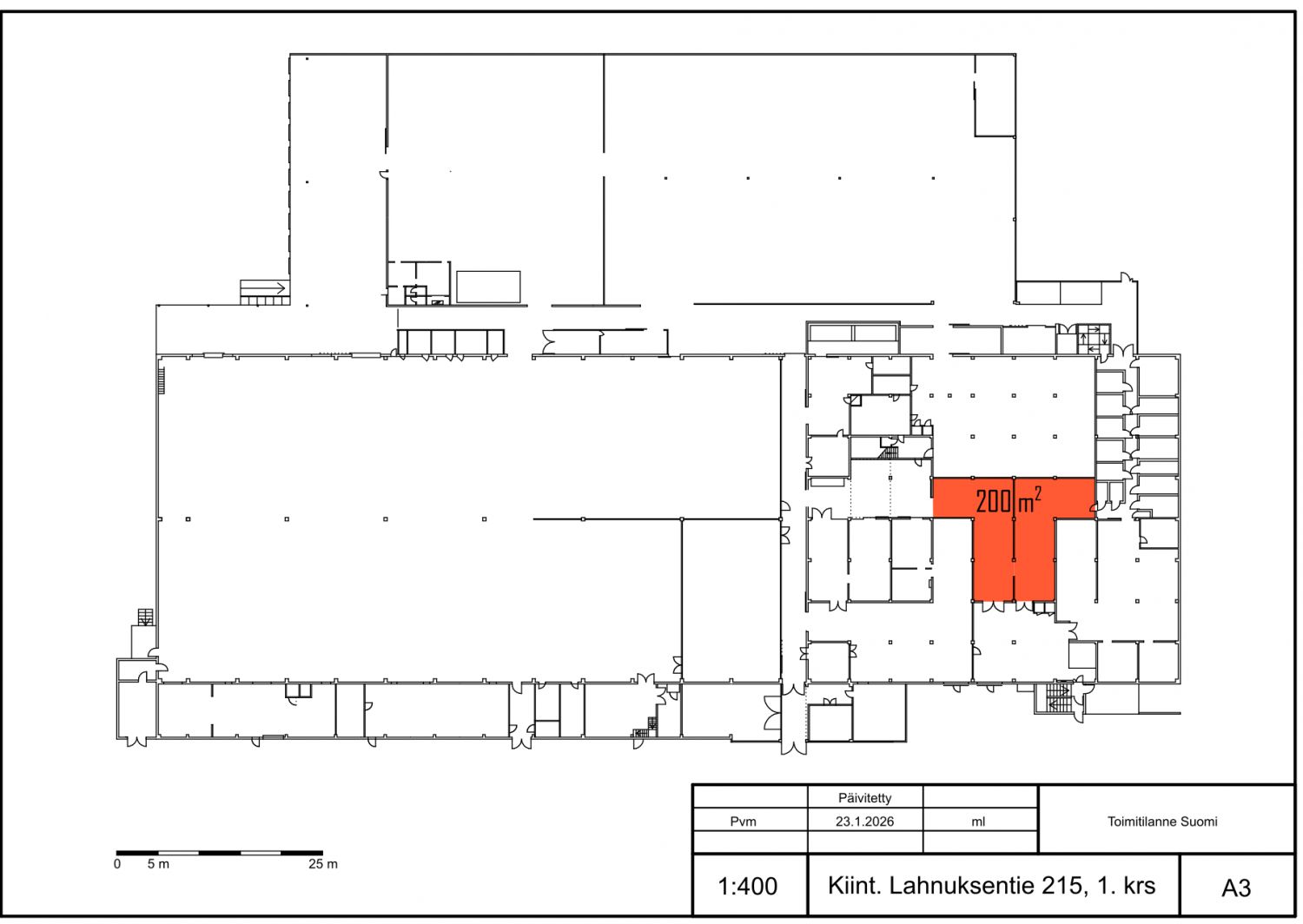 Vuokrattavana siisti ja lämmin noin 200 m2 tuotanto- tai varastotila rakennuksen ensimmäisessä kerroksessa. Tilassa on väliseinä kulkuaukolla. Ei lattiakaivoa, joten tila ei sovellu autopesula- tai korjaamotoimintaan. Oviaukon leveys on 2,20 m. Tila on sisäänajettava, ja nosto-oven koko on 3 x 3 m.