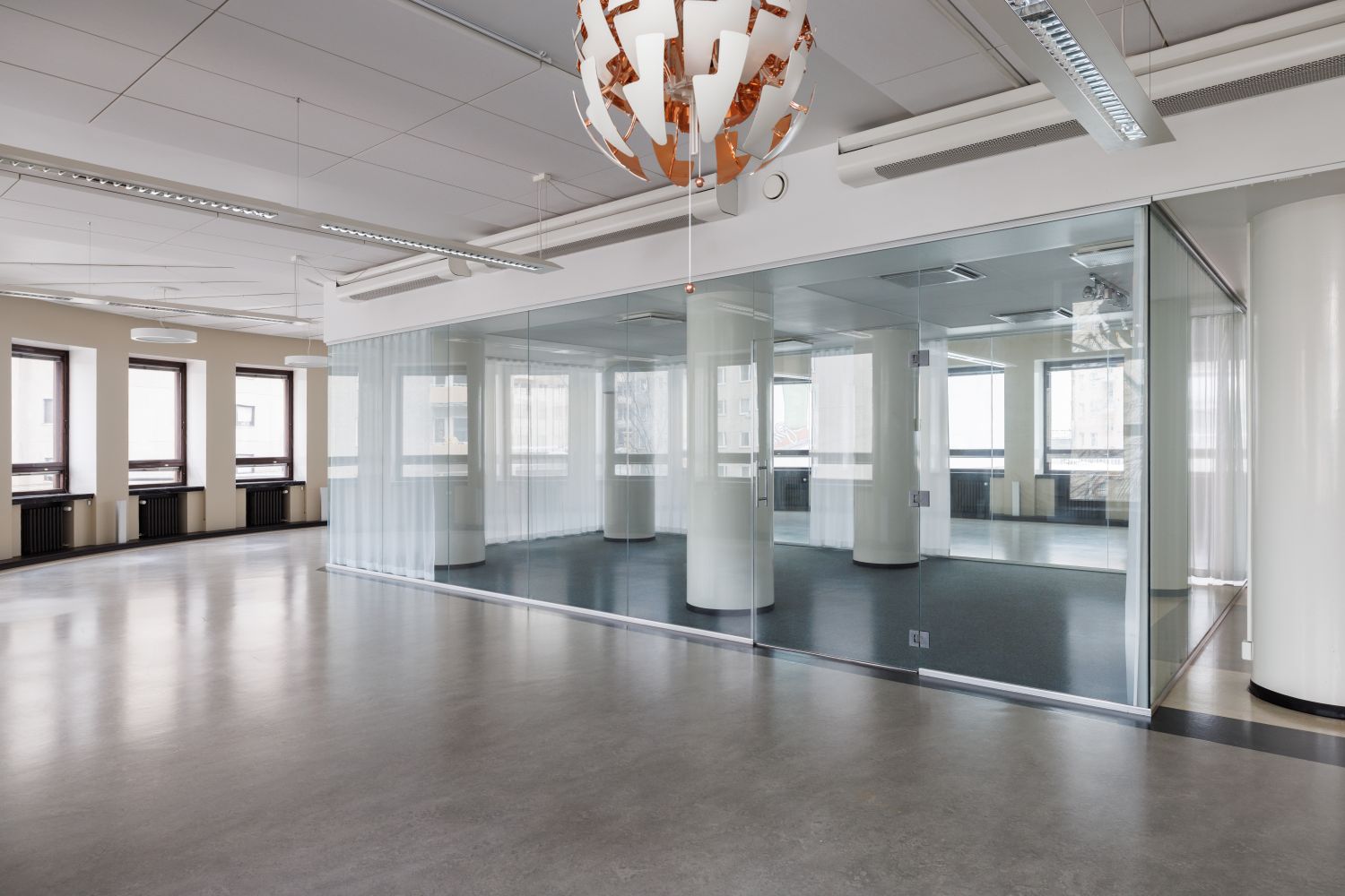 Muuttovalmis ja viimeistelty 218,7 m² toimisto Hämeentie 19:n toisessa kerroksessa. Tilan sydämenä on kaunis kaarevaksi muotoiltu avotoimisto-osuus, jossa rakennuksen alkuperäiset pyöreät pylväät ja suuret tummakarmiset ikkunat luovat tunnelmallisen ja valoisan työympäristön. Avotilan yhteydessä on lasiseinin erotettu erillinen neuvottelu- tai työskentelytila, joka tarjoaa tarvittavan rauhan ilman, että tilan avoimuus kärsii. Tilaan kuuluu myös tyylikäs keittiönurkkaus astianpesukoneella. Kiiltäväpintaiset betonilattiat, design-valaisimet ja läpi tilan kulkeva pyöreälinjaisuus tekevät kokonaisuudesta sekä toimivan että visuaalisesti poikkeuksellisen.