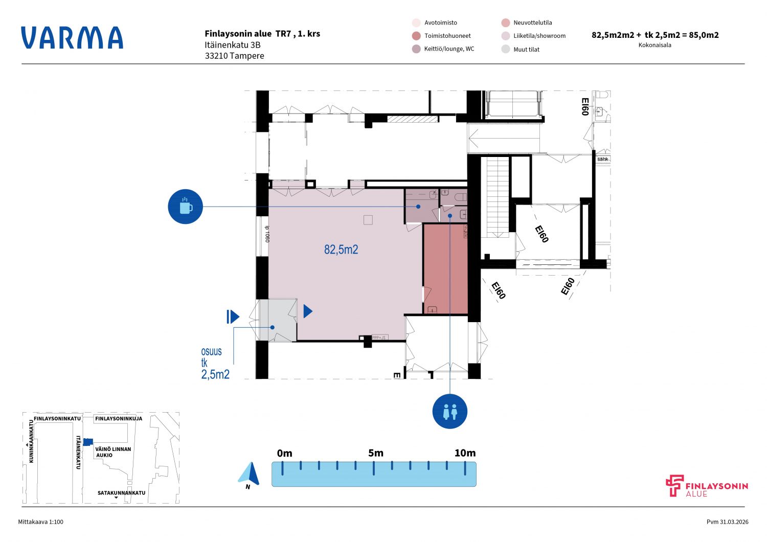 Perinteikäs Finlaysonin alue on vireä liike-elämän, vapaa-ajan ja kulttuuritapahtumien keskus, jossa toimivissa yli 100 yrityksessä työskentelee ja asioi päivittäin tuhansia ihmisiä. Alueen useat ravintolat ja kahvilat mahdollistavat maukkaat lounas- ja kahvihetket. Finlaysonin alueen vanhat tehdasrakennukset tarjoavat yrityksellesi uniikin toimintaympäristön Tammerkosken maisemissa. Finlaysonin alue on helposti saavutettavissa omalla autolla, julkisin kulkuvälinein ja kevyellä liikenteellä. Keskustori ja rautatieasema ovat kävelymatkan etäisyydellä. Kompakti liiketila Itäiselläkadulla Mehiläisen rakennuksen alakerrassa.
