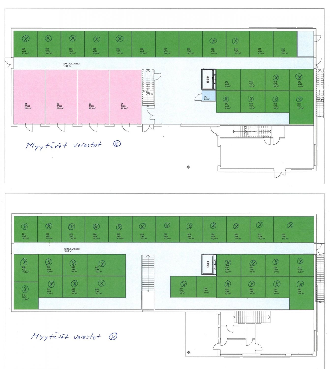 HUOM: Myydään 42 pienvarastoa. Varastojen pinta-ala on jyvitetty pinta-ala, jossa on huomioitu jokaiselle pienvarastolle osuus yhteisista tiloista, kuten esim. sisäänajoaula ja käytävätilat.