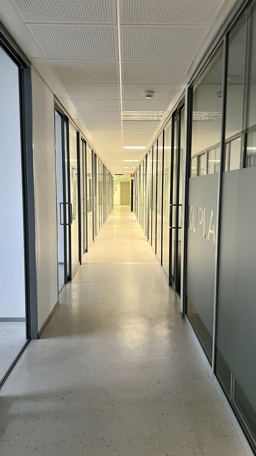 Aula ja taukotila: Oma kerrosaula. Taukotilat ja keittiö ovat toimiston keskellä.