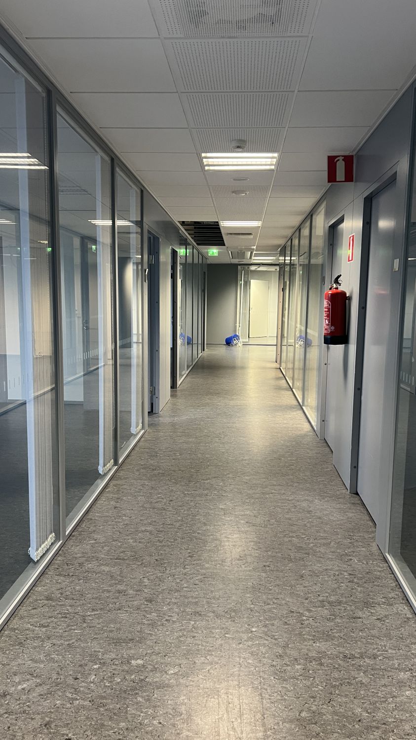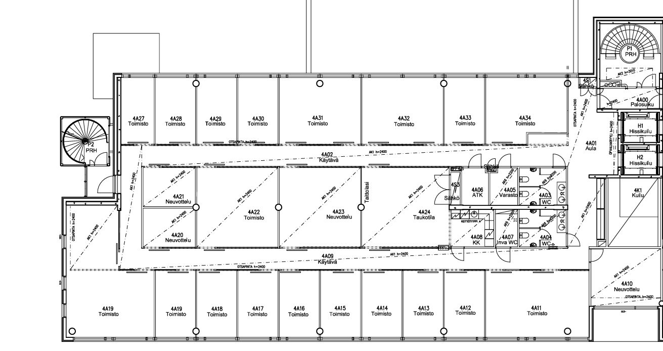 Työpisteet: Toimisto on ympärikäveltävä. Toimistohuoneet ovat ulkokehällä ja neuvotteluhuoneet ja taukotilat keskiosassa. Työhuoneita on 18-19kpl ja neukkareita 4-5kpl.
