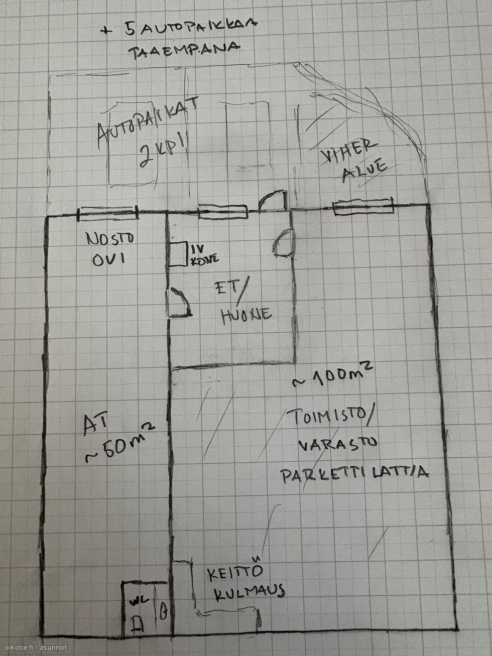 Hinta sisältää lämmityksen ja 5-7 autopaikkaa.
